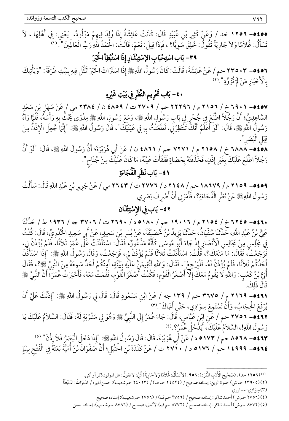 ٥٤٥٧ - ٦٩٠١ خ / ٢١٥٦ م / ٢٢٢٩٦ حم / ٢٧٠٩ ت / ٤٨٥٩ ن / ٢٣٨٤ مي / عَنْ سَهْلِ بْنِ سَعْدٍ السَّاعِدِيَّ؛ أَنَّ رَجُلًا اطَّلَعَ فِي جُحْرٍ فِي بَابِ رَسُولِ اللَّهِ - صلى الله عليه وسلم -، وَمَعَ رَسُولِ اللَّهِ - صلى الله عليه وسلم - مِدْرًى يَحُكُّ بِهِ رَأْسَهُ، فَلَمَّا رَأَىهُ رَسُولُ اللَّهِ - صلى الله عليه وسلم -، قَالَ: "لَوْ أَعْلَمُ أَنَّكَ تَنْتَظِرُنِي، لَطَعَنْتُ بِهِ فِي عَيْنَيْكَ"، قَالَ رَسُولُ اللَّهِ - صلى الله عليه وسلم -: "إِنَّمَا جُعِلَ الْإِذْنُ مِنْ قِبَلِ الْبَصَرِ".