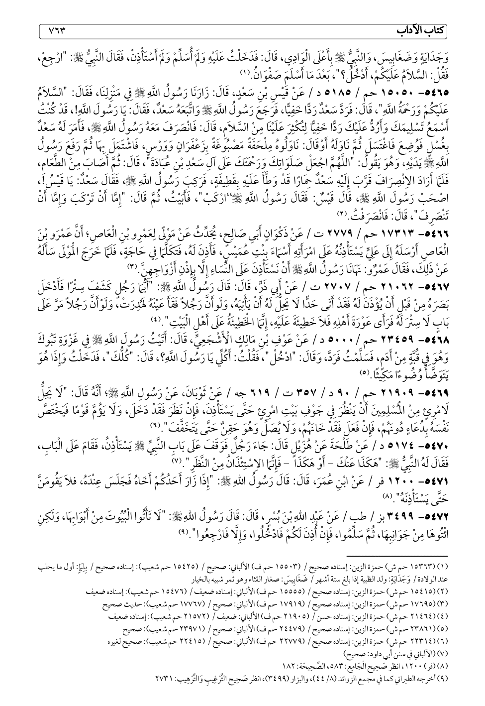 ٥٤٦٥ - ١٥٠٥٠ حم / ٥١٨٥ د / عَنْ قَيْسِ بْنِ سَعْدٍ، قَالَ: زَارَنَا رَسُولُ اللَّهِ - صلى الله عليه وسلم - فِي مَنْزِلِنَا، فَقَالَ: "السَّلَامُ عَلَيْكُمْ وَرَحْمَةُ اللَّهِ"، قَالَ: فَرَدَّ سَعْدٌ رَدًّا خَفِيًّا، فَرَجَعَ رَسُولُ اللَّهِ - صلى الله عليه وسلم - وَاتَّبَعَهُ سَعْدٌ، فَقَالَ: يَا رَسُولَ اللَّهِ!، قَدْ كُنْتُ أَسْمَعُ تَسْلِيمَكَ وَأَرُدُّ عَلَيْكَ رَدًّا خَفِيًّا لِتُكْثِرَ عَلَيْنَا مِنْ السَّلَامِ، قَالَ: فَانْصَرَفَ مَعَهُ رَسُولُ اللَّهِ - صلى الله عليه وسلم -، فَأَمَرَ لَهُ سَعْدٌ بِغُسْلٍ فَوُضِعَ فَاغْتَسَلَ ثُمَّ نَاوَلَهُ أَوْقَالَ: نَاوَلُوهُ مِلْحَفَةً مَصْبُوغَةً بِزَعْفَرَانٍ وَوَرْسٍ، فَاشْتَمَلَ بِهَا ثُمَّ رَفَعَ رَسُولُ اللَّهِ - صلى الله عليه وسلم - يَدَيْهِ، وَهُوَ يَقُولُ: "اللَّهُمَّ اجْعَلْ صَلَوَاتِكَ وَرَحْمَتَكَ عَلَى آلِ سَعْدِ بْنِ عُبَادَةَ"، قَالَ: ثُمَّ أَصَابَ مِنْ الطَّعَامِ، فَلَمَّا أَرَادَ الِانْصِرَافَ قَرَّبَ إِلَيْهِ سَعْدٌ حِمَارًا قَدْ وَطَّأَ عَلَيْهِ بِقَطِيفَةٍ، فَرَكِبَ رَسُولُ اللَّهِ - صلى الله عليه وسلم -، فَقَالَ سَعْدٌ: يَا قَيْسُ!، اصْحَبْ رَسُولَ اللَّهِ - صلى الله عليه وسلم -، قَالَ قَيْسٌ: فَقَالَ رَسُولُ اللَّهِ - صلى الله عليه وسلم - "ارْكَبْ"، فَأَبَيْتُ، ثُمَّ قَالَ: "إِمَّا أَنْ تَرْكَبَ وَإِمَّا أَنْ تَنْصَرِفَ"، قَالَ: فَانْصَرَفْتُ. (¬٢)