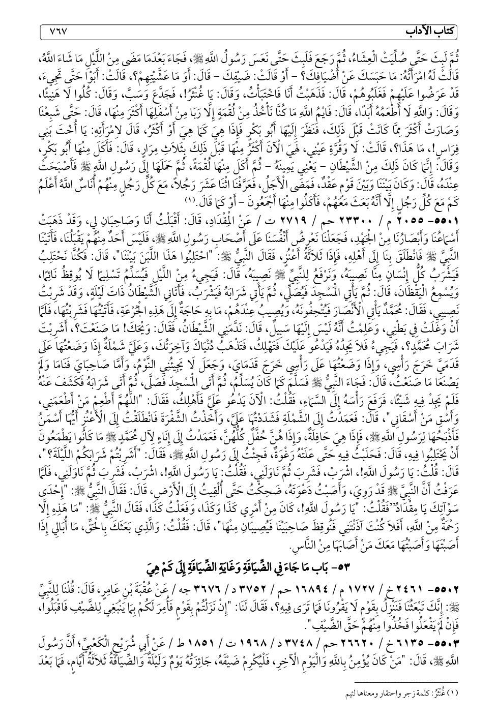 ٥٥٠١ - ٢٠٥٥ م / ٢٣٣٠٠ حم / ٢٧١٩ ت / عَنْ الْمِقْدَادِ، قَالَ: أَقْبَلْتُ أَنَا وَصَاحِبَانِ لِي، وَقَدْ ذَهَبَتْ أَسْمَاعُنَا وَأَبْصَارُنَا مِنْ الْجَهْدِ، فَجَعَلْنَا نَعْرِضُ أَنْفُسَنَا عَلَى أَصْحَابِ رَسُولِ اللَّهِ - صلى الله عليه وسلم -، فَلَيْسَ أَحَدٌ مِنْهُمْ يَقْبَلُنَا، فَأَتَيْنَا النَّبِيَّ - صلى الله عليه وسلم - فَانْطَلَقَ بِنَا إِلَى أَهْلِهِ، فَإِذَا ثَلَاثَةُ أَعْنُزٍ، فَقَالَ النَّبِيُّ - صلى الله عليه وسلم -: "احْتَلِبُوا هَذَا اللَّبَنَ بَيْنَنَا"، قَالَ: فَكُنَّا نَحْتَلِبُ فَيَشْرَبُ كُلُّ إِنْسَانٍ مِنَّا نَصِيبَهُ، وَنَرْفَعُ لِلنَّبِيِّ - صلى الله عليه وسلم - نَصِيبَهُ، قَالَ: فَيَجِيءُ مِنْ اللَّيْلِ فَيُسَلِّمُ تَسْلِيمًا لَا يُوقِظُ نَائِمًا، وَيُسْمِعُ الْيَقْظَانَ، قَالَ: ثُمَّ يَأْتِي الْمَسْجِدَ فَيُصَلِّي، ثُمَّ يَأْتِي شَرَابَهُ فَيَشْرَبُ، فَأَتَانِي الشَّيْطَانُ ذَاتَ لَيْلَةٍ، وَقَدْ شَرِبْتُ نَصِيبِي، فَقَالَ: مُحَمَّدٌ يَأْتِي الْأَنْصَارَ فَيُتْحِفُونَهُ، وَيُصِيبُ عِنْدَهُمْ، مَا بِهِ حَاجَةٌ إِلَى هَذِهِ الْجُرْعَةِ، فَأَتَيْتُهَا فَشَرِبْتُهَا، فَلَمَّا أَنْ وَغَلَتْ فِي بَطْنِي، وَعَلِمْتُ أَنَّهُ لَيْسَ إِلَيْهَا سَبِيلٌ، قَالَ: نَدَّمَنِي الشَّيْطَانُ، فَقَالَ: وَيْحَكَ! مَا صَنَعْتَ؟، أَشَرِبْتَ شَرَابَ مُحَمَّدٍ؟، فَيَجِيءُ فَلَا يَجِدُهُ فَيَدْعُو عَلَيْكَ فَتَهْلِكُ، فَتَذْهَبُ دُنْيَاكَ وَآخِرَتُكَ، وَعَلَيَّ شَمْلَةٌ إِذَا وَضَعْتُهَا عَلَى قَدَمَيَّ خَرَجَ رَأْسِي، وَإِذَا وَضَعْتُهَا عَلَى رَأْسِي خَرَجَ قَدَمَايَ، وَجَعَلَ لَا يَجِيئُنِي النَّوْمُ، وَأَمَّا صَاحِبَايَ فَنَامَا وَلَمْ يَصْنَعَا مَا صَنَعْتُ، قَالَ: فَجَاءَ النَّبِيُّ - صلى الله عليه وسلم - فَسَلَّمَ كَمَا كَانَ يُسَلِّمُ، ثُمَّ أَتَى الْمَسْجِدَ