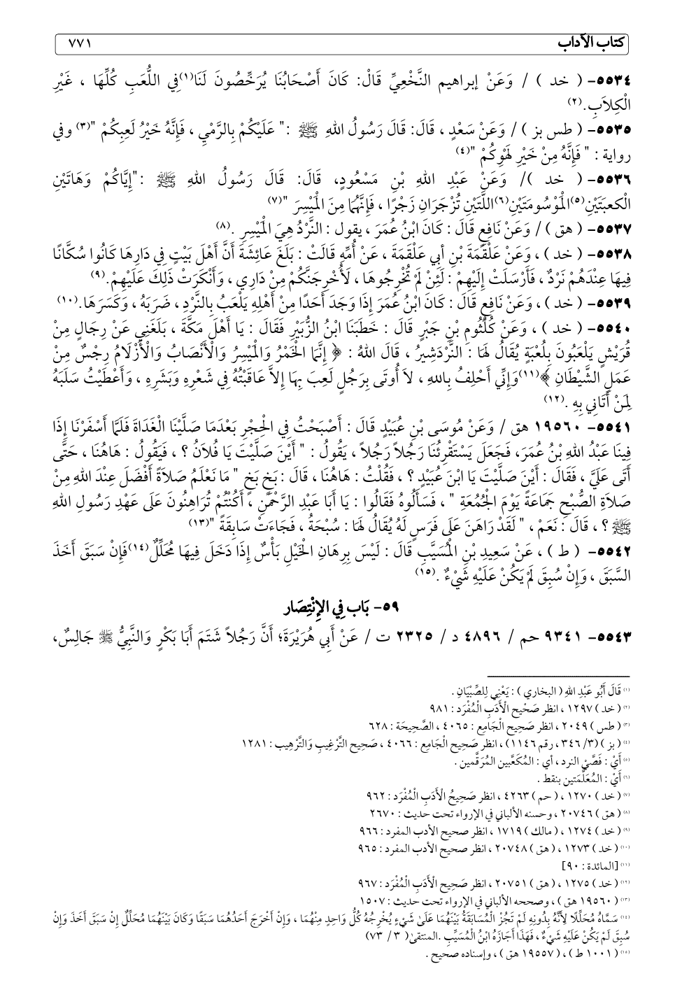 ٥٥٣٤ - (خد) / وَعَنْ إبراهيم النَّخْعِيِّ قَالْ: كَانَ أَصْحَابُنَا يُرَخِّصُونَ لَنَا (¬١) فِي اللُّعَبِ كُلِّهَا، غَيْرِ الْكِلَابِ. (¬٢)