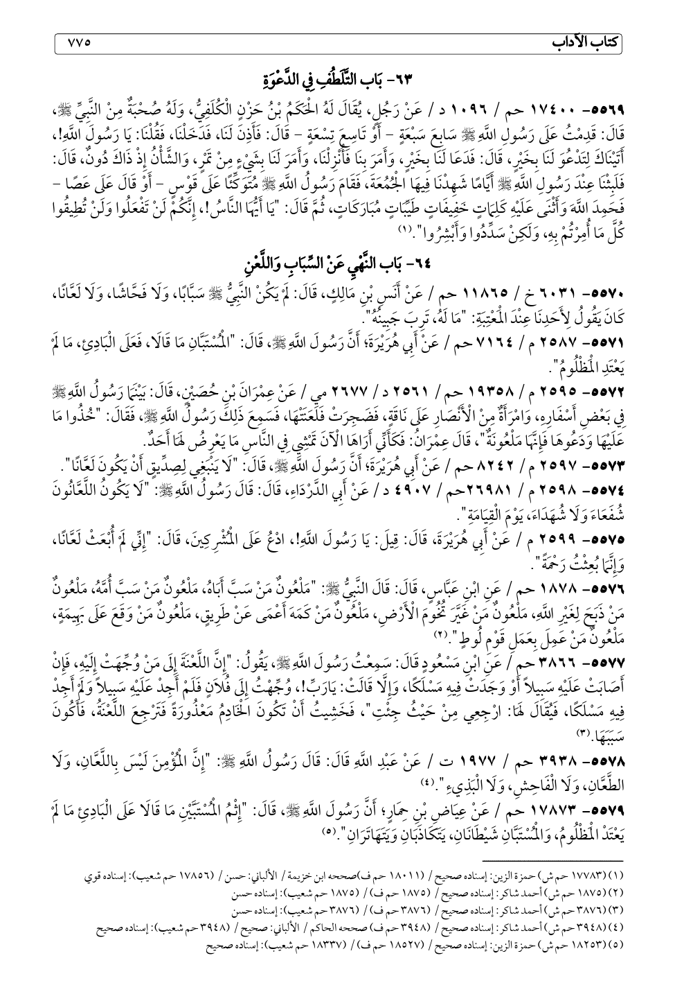 ٥٥٧٣ - ٢٥٩٧ م / ٨٢٤٢ حم / عَنْ أَبِي هُرَيْرَةَ؛ أَنَّ رَسُولَ اللَّهِ - صلى الله عليه وسلم -، قَالَ: "لَا يَنْبَغِي لِصِدِّيقٍ أَنْ يَكُونَ لَعَّانًا".