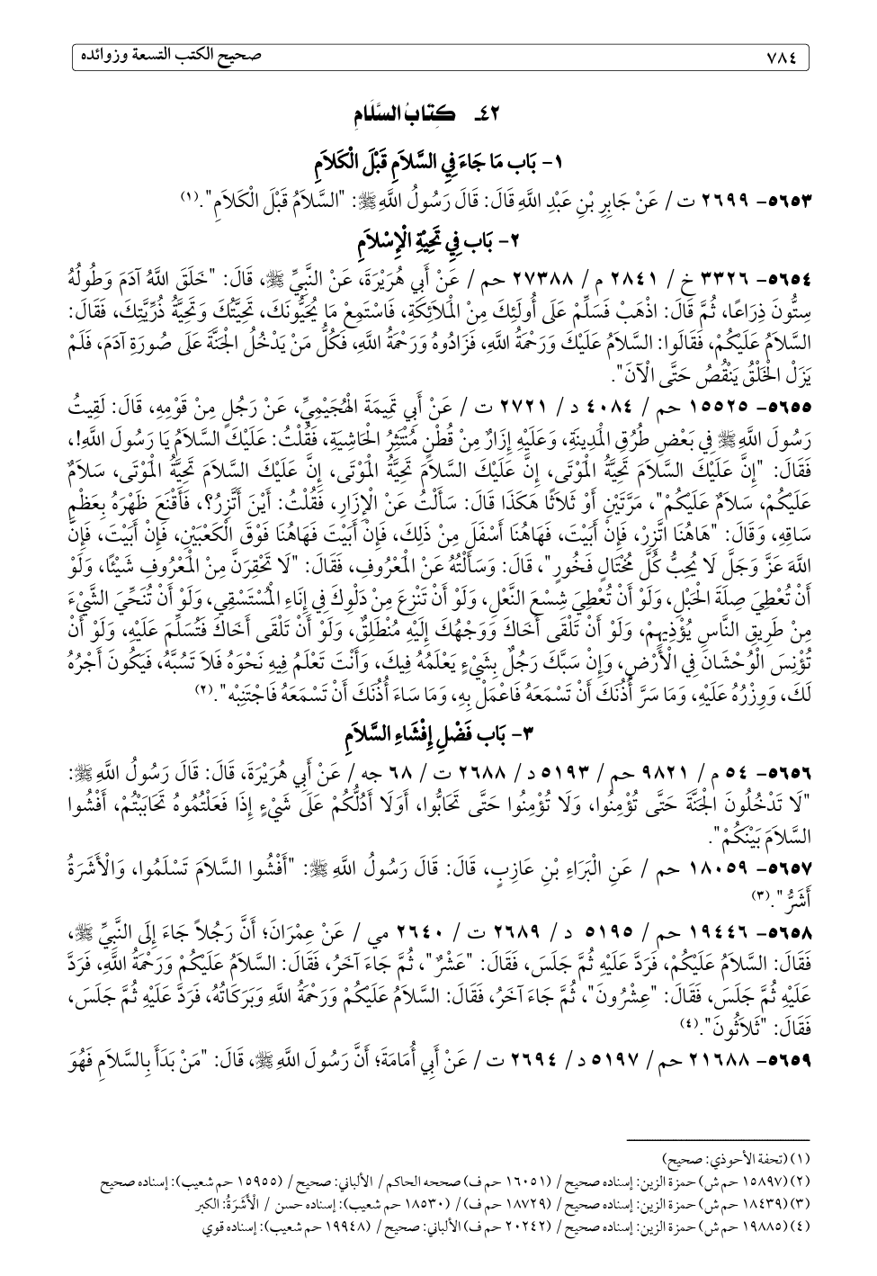 ٥٦٥٣ - ٢٦٩٩ ت / عَنْ جَابِرِ بْنِ عَبْدِ اللَّهِ قَالَ: قَالَ رَسُولُ اللَّهِ - صلى الله عليه وسلم -: "السَّلَامُ قَبْلَ الْكَلَامِ". (¬١)