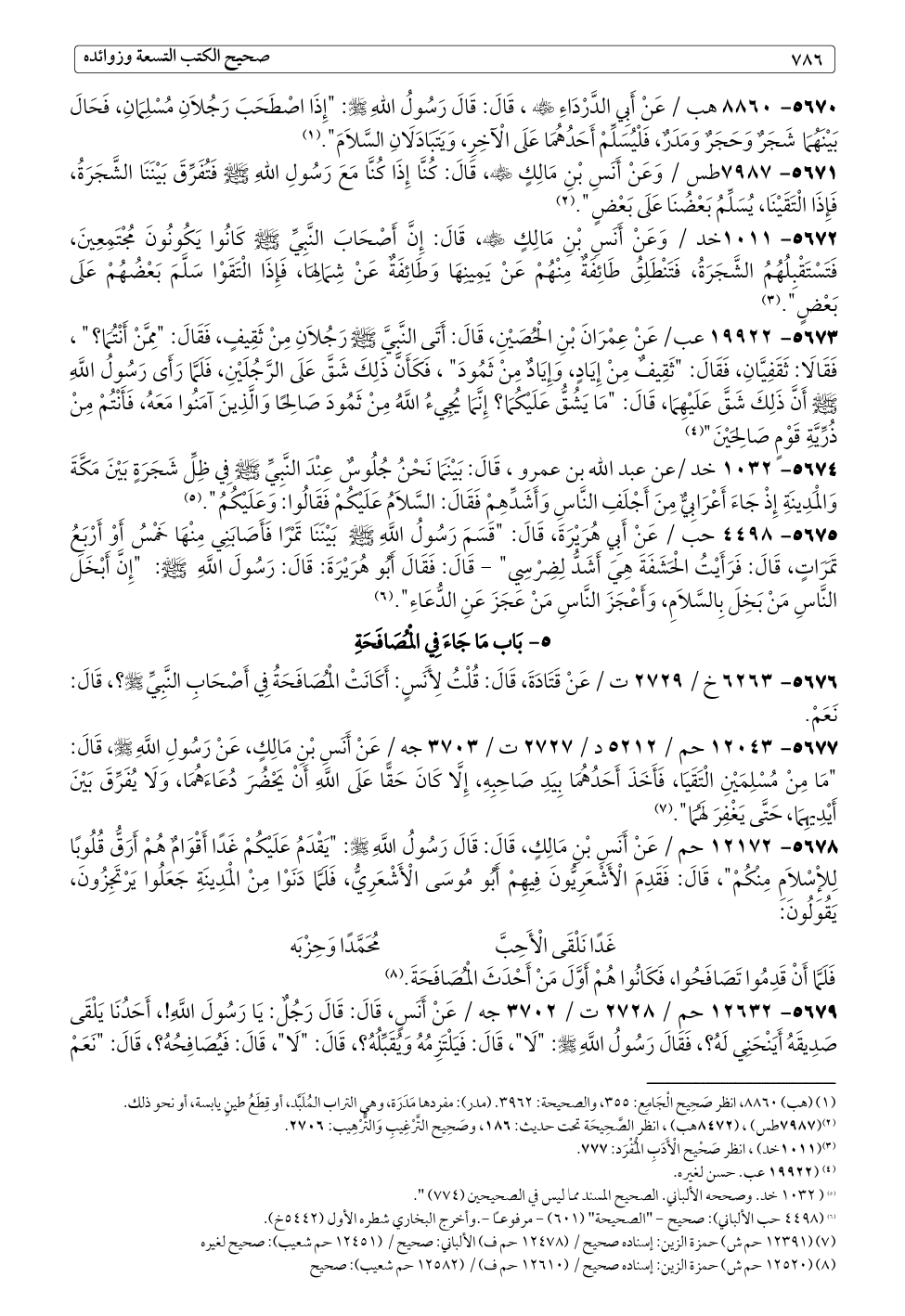 ٥٦٧٦ - ٦٢٦٣ خ / ٢٧٢٩ ت / عَنْ قَتَادَةَ، قَالَ: قُلْتُ لِأَنَسٍ: أَكَانَتْ الْمُصَافَحَةُ فِي أَصْحَابِ النَّبِيِّ - صلى الله عليه وسلم -؟، قَالَ: نَعَمْ.