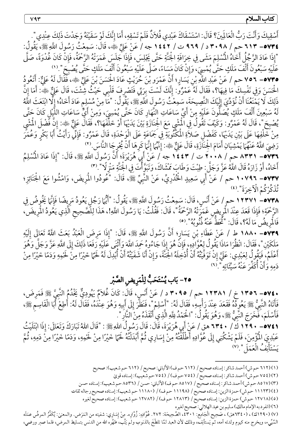 (¬٧) (١٢٩٠ ك)، (٦٣٤٠ هق)، صَحِيح الْجَامِع: ٤٣٠١، الصَّحِيحَة: ٢٧٢. عُوَّادِهِ: زُوَّارِه. مِنْ إِسَارِي: شفيته من المَرَض. والمعنى: يُكَفِّرُ المرضُ عمَلَه السَّيِّيء، ويخرج منه كيوم ولدته أمه، ثم يَستأنِف، وذلك لأن العبد لمَّا تلطّخَ بالذنوب ولم يَتُب، طهَّره الله من الدنس بتسليط المرض، فلما صبر ورضي، أطلقه من أَسْره بعدما غَفر له ما كان من إصْره ليَصلُح لجواره بدار إكرامه، فبلاؤُه نعمة وسَقَمُه مِنَّة. فيض القدير (٤/ ٦٤٨)