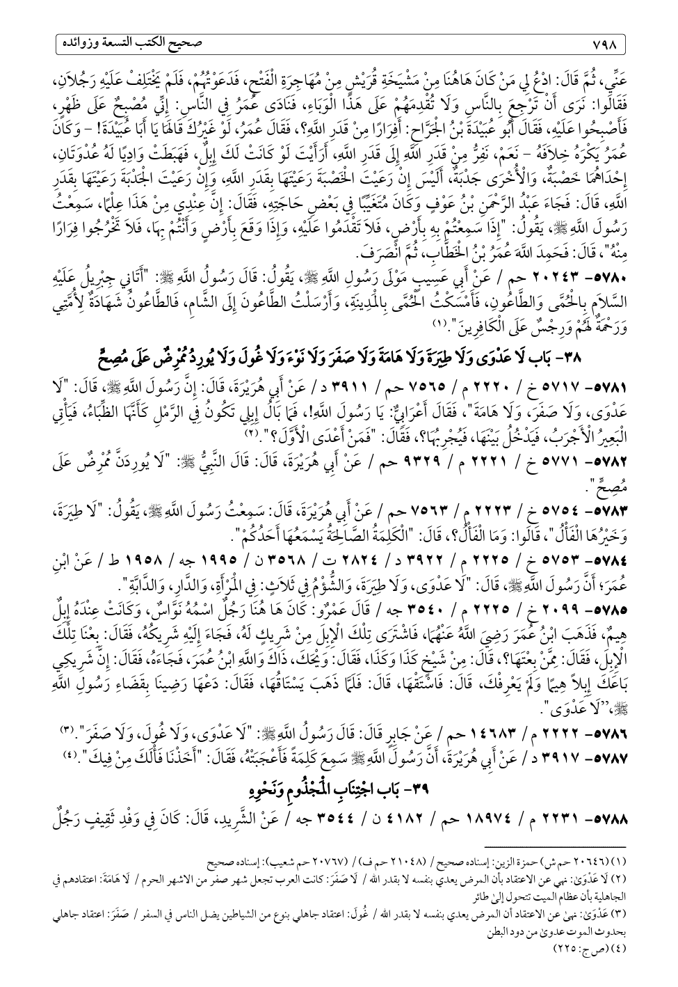 (¬٢) لَا عَدْوَى: نهي عن الاعتقاد بأن المرض يعدي بنفسه لا بقدر الله / لَا صَفَرَ: كانت العرب تجعل شهر صفر من الاشهر الحرم / لَا هَامَةَ: اعتقادهم في الجاهلية بأن عظام الميت تتحول إلى طائر