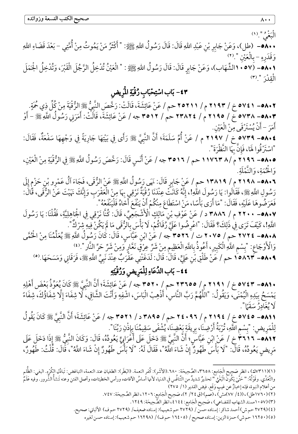 ٥٨٠٦ - ٢١٩٨ م / ١٣٨١٩ حم / عَنْ جَابِرٍ قَالَ: نَهَى رَسُولُ اللَّهِ - صلى الله عليه وسلم - عَنْ الرُّقَى، فَجَاءَ آلُ عَمْرِو بْنِ حَزْمٍ إِلَى رَسُولِ اللَّهِ - صلى الله عليه وسلم -، فَقَالَوا: يَا رَسُولَ اللَّهِ!، إِنَّهُ كَانَتْ عِنْدَنَا رُقْيَةٌ نَرْقِي بِهَا مِنْ الْعَقْرَبِ وَإِنَّكَ نَهَيْتَ عَنْ الرُّقَى، قَالَ: فَعَرَضُوهَا عَلَيْهِ، فَقَالَ: "مَا أَرَى بَأْسًا، مَنْ اسْتَطَاعَ مِنْكُمْ أَنْ يَنْفَعَ أَخَاهُ فَلْيَنْفَعْهُ".