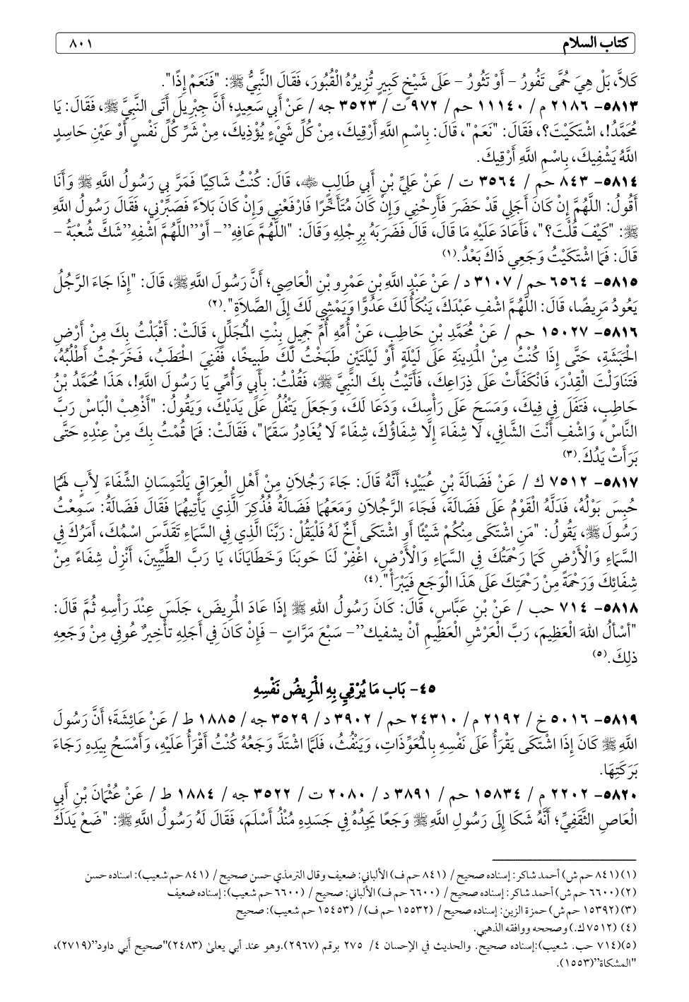 ٥٨١٣ - ٢١٨٦ م / ١١١٤٠ حم / ٩٧٢ ت / ٣٥٢٣ جه / عَنْ أَبِي سَعِيدٍ؛ أَنَّ جِبْرِيلَ أَتَى النَّبِيَّ - صلى الله عليه وسلم -، فَقَالَ: يَا مُحَمَّدُ!، اشْتَكَيْتَ؟، فَقَالَ: "نَعَمْ"، قَالَ: بِاسْمِ اللَّهِ أَرْقِيكَ، مِنْ كُلِّ شَيْءٍ يُؤْذِيكَ، مِنْ شَرِّ كُلِّ نَفْسٍ أَوْ عَيْنِ حَاسِدٍ اللَّهُ يَشْفِيكَ، بِاسْمِ اللَّهِ أَرْقِيكَ.