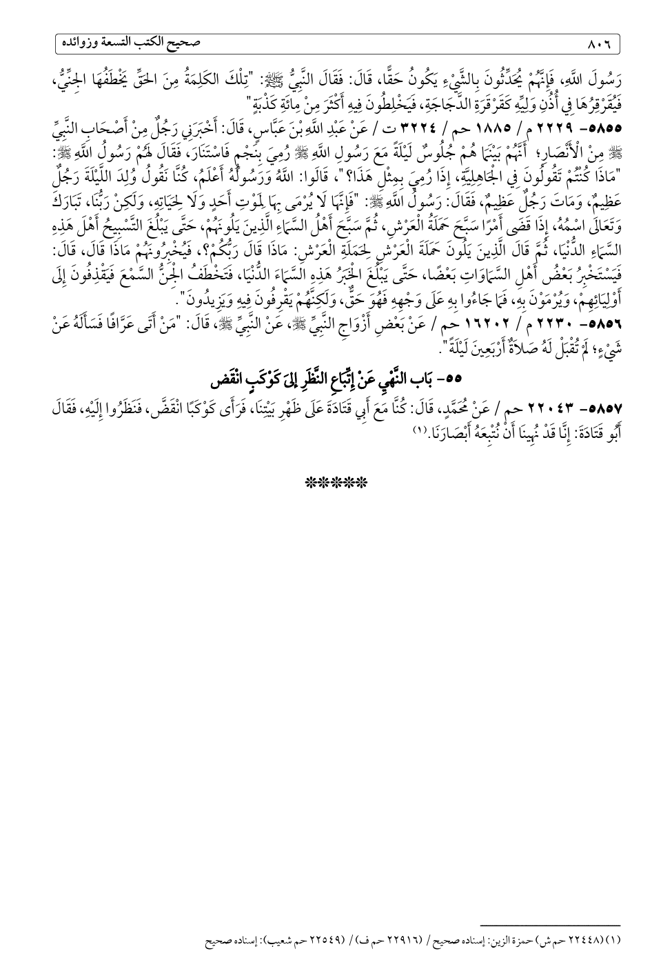٥٨٥٥ - ٢٢٢٩ م / ١٨٨٥ حم / ٣٢٢٤ ت / عَنْ عَبْدِ اللَّهِ بْنَ عَبَّاسٍ، قَالَ: أَخْبَرَنِي رَجُلٌ مِنْ أَصْحَابِ النَّبِيِّ - صلى الله عليه وسلم - مِنْ الْأَنْصَارِ؛ أَنَّهُمْ بَيْنَمَا هُمْ جُلُوسٌ لَيْلَةً مَعَ رَسُولِ اللَّهِ - صلى الله عليه وسلم - رُمِيَ بِنَجْمٍ فَاسْتَنَارَ، فَقَالَ لَهُمْ رَسُولُ اللَّهِ - صلى الله عليه وسلم -: "مَاذَا كُنْتُمْ تَقُولُونَ فِي الْجَاهِلِيَّةِ، إِذَا رُمِيَ بِمِثْلِ هَذَا؟ "، قَالَوا: اللَّهُ وَرَسُولُهُ أَعْلَمُ، كُنَّا نَقُولُ وُلِدَ اللَّيْلَةَ رَجُلٌ عَظِيمٌ، وَمَاتَ رَجُلٌ عَظِيمٌ، فَقَالَ: رَسُولُ اللَّهِ - صلى الله عليه وسلم -: "فَإِنَّهَا لَا يُرْمَى بِهَا لِمَوْتِ أَحَدٍ وَلَا لِحَيَاتِهِ، وَلَكِنْ رَبُّنَا، تَبَارَكَ وَتَعَالَى اسْمُهُ، إِذَا قَضَى أَمْرًا سَبَّحَ حَمَلَةُ الْعَرْشِ، ثُمَّ سَبَّحَ أَهْلُ السَّمَاءِ الَّذِينَ يَلُونَهُمْ، حَتَّى يَبْلُغَ التَّسْبِيحُ أَهْلَ هَذِهِ السَّمَاءِ الدُّنْيَا، ثُمَّ قَالَ الَّذِينَ يَلُونَ حَمَلَةَ الْعَرْشِ لِحَمَلَةِ الْعَرْشِ: مَاذَا قَالَ رَبُّكُمْ؟، فَيُخْبِرُونَهُمْ مَاذَا قَالَ، قَالَ: فَيَسْتَخْبِرُ بَعْضُ أَهْلِ السَّمَاوَاتِ بَعْضًا، حَتَّى يَبْلُغَ الْخَبَرُ هَذِهِ السَّمَاءَ الدُّنْيَا، فَتَخْطَفُ الْجِنُّ السَّمْعَ فَيَقْذِفُونَ إِلَى أَوْلِيَائِهِمْ، وَيُرْمَوْنَ بِهِ، فَمَا جَاءُوا بِهِ عَلَى وَجْهِهِ فَهُوَ حَقٌّ، وَلَكِنَّهُمْ يَقْرِفُونَ فِيهِ وَيَزِيدُونَ".