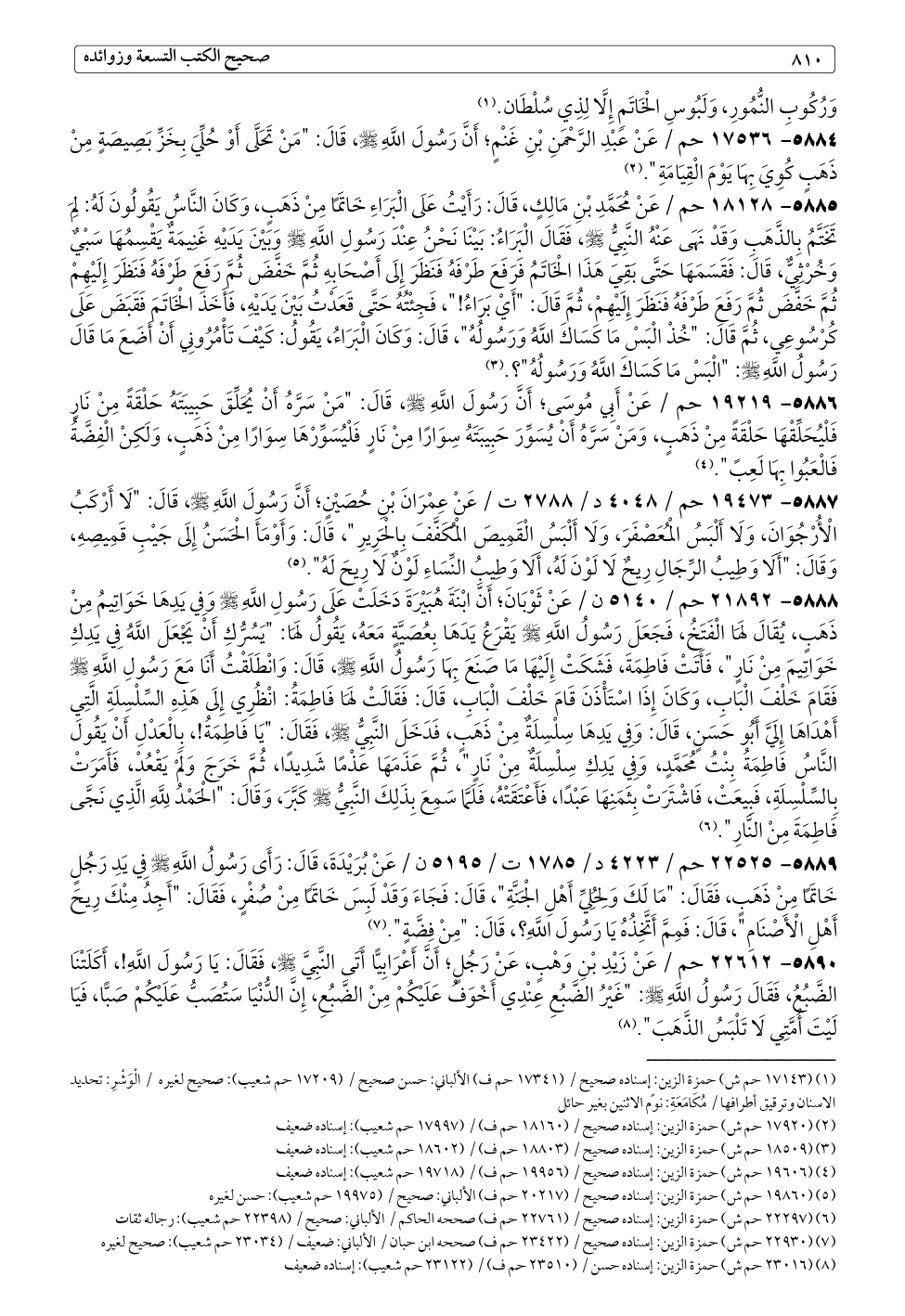 ٥٨٨٨ - ٢١٨٩٢ حم / ٥١٤٠ ن / عَنْ ثَوْبَانَ؛ أَنَّ ابْنَةَ هُبَيْرَةَ دَخَلَتْ عَلَى رَسُولِ اللَّهِ - صلى الله عليه وسلم - وَفِي يَدِهَا خَوَاتِيمُ مِنْ ذَهَبٍ، يُقَالَ لَهَا الْفَتَخُ، فَجَعَلَ رَسُولُ اللَّهِ - صلى الله عليه وسلم - يَقْرَعُ يَدَهَا بِعُصَيَّةٍ مَعَهُ، يَقُولُ لَهَا: "يَسُرُّكِ أَنْ يَجْعَلَ اللَّهُ فِي يَدِكِ خَوَاتِيمَ مِنْ نَارٍ"، فَأَتَتْ فَاطِمَةَ، فَشَكَتْ إِلَيْهَا مَا صَنَعَ بِهَا رَسُولُ اللَّهِ - صلى الله عليه وسلم -، قَالَ: وَانْطَلَقْتُ أَنَا مَعَ رَسُولِ اللَّهِ - صلى الله عليه وسلم - فَقَامَ خَلْفَ الْبَابِ، وَكَانَ إِذَا اسْتَأْذَنَ قَامَ خَلْفَ الْبَابِ، قَالَ: فَقَالَتْ لَهَا فَاطِمَةُ: انْظُرِي إِلَى هَذِهِ السِّلْسِلَةِ الَّتِي أَهْدَاهَا إِلَيَّ أَبُو حَسَنٍ، قَالَ: وَفِي يَدِهَا سِلْسِلَةٌ مِنْ ذَهَبٍ، فَدَخَلَ النَّبِيُّ - صلى الله عليه وسلم -، فَقَالَ: "يَا فَاطِمَةُ!، بِالْعَدْلِ أَنْ يَقُولَ النَّاسُ فَاطِمَةُ بِنْتُ مُحَمَّدٍ، وَفِي يَدِكِ سِلْسِلَةٌ مِنْ نَارٍ"، ثُمَّ عَذَمَهَا عَذْمًا شَدِيدًا، ثُمَّ خَرَجَ وَلَمْ يَقْعُدْ، فَأَمَرَتْ بِالسِّلْسِلَةِ، فَبِيعَتْ، فَاشْتَرَتْ بِثَمَنِهَا عَبْدًا، فَأَعْتَقَتْهُ، فَلَمَّا سَمِعَ بِذَلِكَ النَّبِيُّ - صلى الله عليه وسلم - كَبَّرَ، وَقَالَ: "الْحَمْدُ لِلَّهِ الَّذِي نَجَّى فَاطِمَةَ مِنْ النَّارِ". (¬٦)