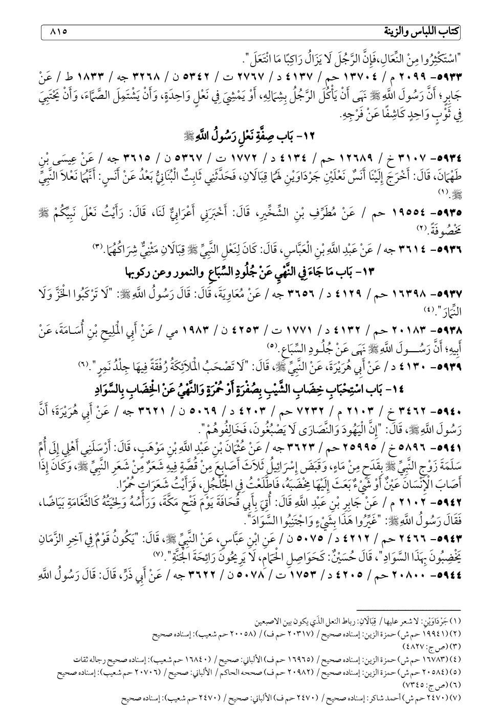 ٥٩٣٦ - ٣٦١٤ جه / عَنْ عَبْدِ اللَّهِ بْنِ الْعَبَّاسِ، قَالَ: كَانَ لِنَعْلِ النَّبِيِّ - صلى الله عليه وسلم - قِبَالَانِ مَثْنِيٌّ شِرَاكُهُمَا. (¬٣)