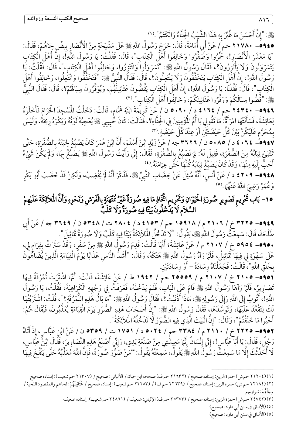 ٥٩٥٢ - ٢٢٢٥ خ / ٢١١٠ م / ٣٣٨٤ حم / ٥٠٢٤ د / ١٧٥١ ت / ٥٣٥٩ ن / عَنْ ابْنِ عَبَّاسٍ، إِذْ أَتَاهُ رَجُلٌ، فَقَالَ: يَا أَبَا عَبَّاسٍ!، إِنِّي إِنْسَانٌ إِنَّمَا مَعِيشَتِي مِنْ صَنْعَةِ يَدِي، وَإِنِّي أَصْنَعُ هَذِهِ التَّصَاوِيرَ، فَقَالَ ابْنُ عَبَّاسٍ، لَا أُحَدِّثُكَ إِلَّا مَا سَمِعْتُ رَسُولَ اللَّهِ - صلى الله عليه وسلم - يَقُولُ، سَمِعْتُهُ يَقُولُ: "مَنْ صَوَّرَ صُورَةً، فَإِنَّ اللَّهَ مُعَذِّبُهُ حَتَّى يَنْفُخَ فِيهَا