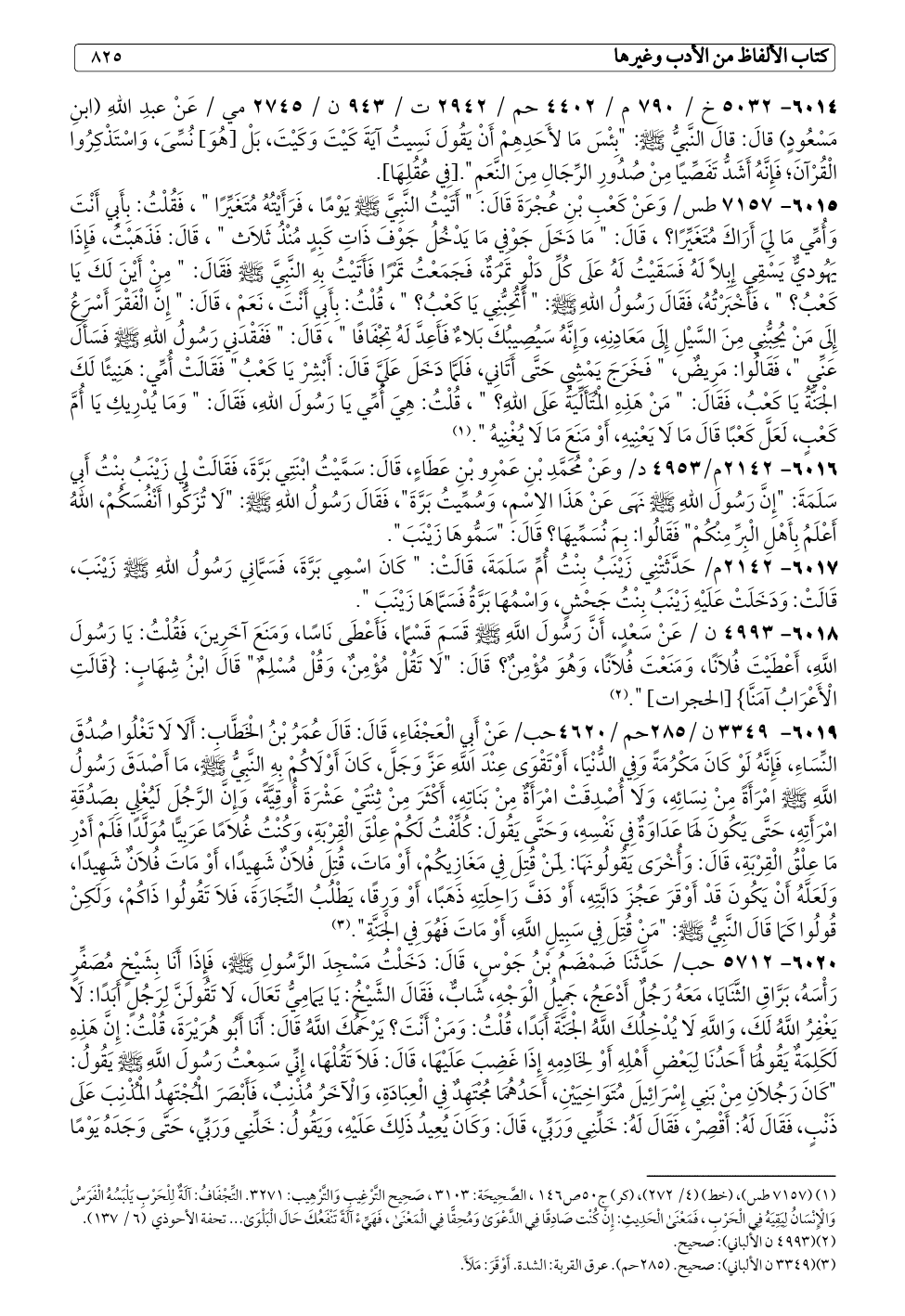 ٦٠١٧ - ٢١٤٢ م/ حَدَّثَتْنِي زَيْنَبُ بِنْتُ أُمِّ سَلَمَةَ، قَالَتْ: " كَانَ اسْمِي بَرَّةَ، فَسَمَّانِي رَسُولُ اللهِ - صلى الله عليه وسلم - زَيْنَبَ، قَالَتْ: وَدَخَلَتْ عَلَيْهِ زَيْنَبُ بِنْتُ جَحْشٍ، وَاسْمُهَا بَرَّةُ فَسَمَّاهَا زَيْنَبَ ".