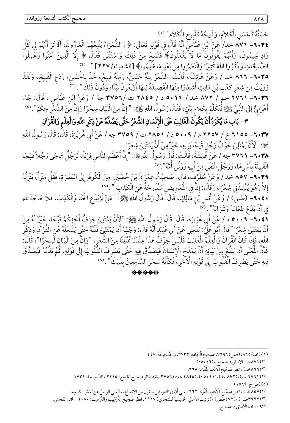 ٦٠٣٧ - ٦١٥٥ خ / ٢٢٥٧ م / ٥٠٠٩ د / ٢٨٥١ ت / ٣٧٥٩ جه / عَنْ أَبِي هُرَيْرَةَ، قَالَ: قَالَ رَسُولُ اللَّهِ - صلى الله عليه وسلم -: "لَأَنْ يَمْتَلِئَ جَوْفُ رَجُلٍ قَيْحًا يَرِيهِ، خَيْرٌ مِنْ أَنْ يَمْتَلِئَ شِعْرًا".