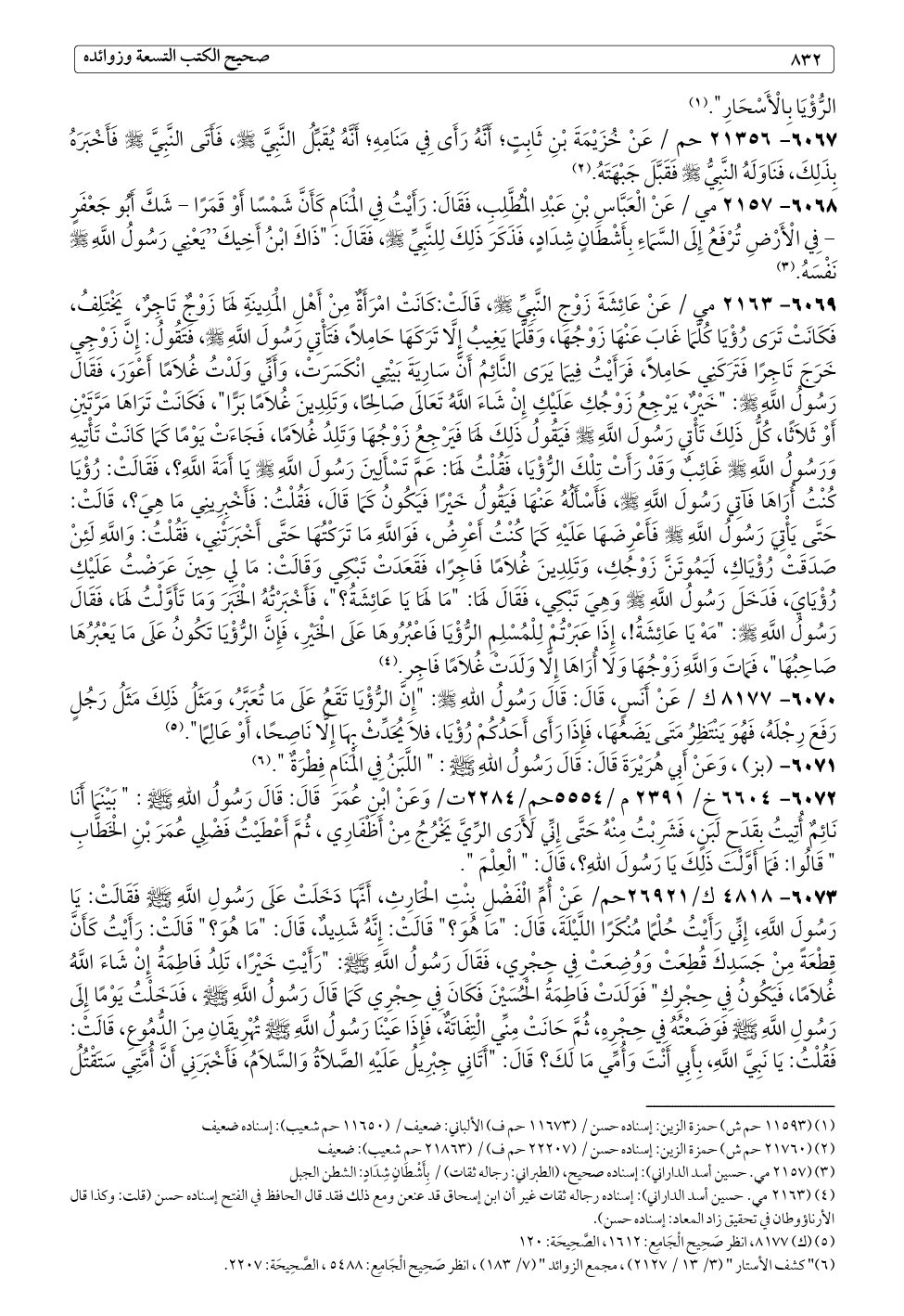 ٦٠٦٧ - ٢١٣٥٦ حم / عَنْ خُزَيْمَةَ بْنِ ثَابِتٍ؛ أَنَّهُ رَأَى فِي مَنَامِهِ؛ أَنَّهُ يُقَبِّلُ النَّبِيَّ - صلى الله عليه وسلم -، فَأَتَى النَّبِيَّ - صلى الله عليه وسلم - فَأَخْبَرَهُ بِذَلِكَ، فَنَاوَلَهُ النَّبِيُّ - صلى الله عليه وسلم - فَقَبَّلَ جَبْهَتَهُ. (¬٢)