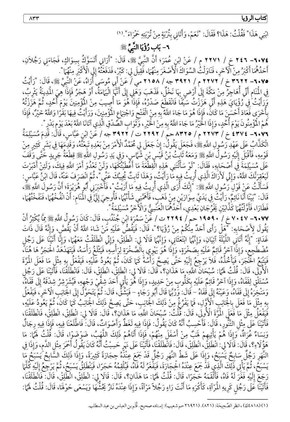 ٦٠٧٦ - ٤٣٧٤ خ / ٢٢٧٣ م / ٨٣٢٥ حم / ٢٢٩٢ ت / ٣٩٢٢ جه / عَنْ ابْنِ عَبَّاسٍ، قَالَ: قَدِمَ مُسَيْلِمَةُ الْكَذَّابُ عَلَى عَهْدِ رَسُولِ اللَّهِ - صلى الله عليه وسلم -، فَجَعَلَ يَقُولُ: إِنْ جَعَلَ لِي مُحَمَّدٌ الْأَمْرَ مِنْ بَعْدِهِ تَبِعْتُهُ، وَقَدِمَهَا فِي بَشَرٍ كَثِيرٍ مِنْ قَوْمِهِ، فَأَقْبَلَ إِلَيْهِ رَسُولُ اللَّهِ - صلى الله عليه وسلم - وَمَعَهُ ثَابِتُ بْنُ قَيْسِ بْنِ شَمَّاسٍ، وَفِي يَدِ رَسُولِ اللَّهِ - صلى الله عليه وسلم - قِطْعَةُ جَرِيدٍ حَتَّى وَقَفَ عَلَى مُسَيْلِمَةَ فِي أَصْحَابِهِ، فَقَالَ: "لَوْ سَأَلْتَنِي هَذِهِ الْقِطْعَةَ مَا أَعْطَيْتُكَهَا، وَلَنْ تَعْدُوَ أَمْرَ اللَّهِ فِيكَ، وَلَئِنْ أَدْبَرْتَ لَيَعْقِرَنَّكَ اللَّهُ، وَإِنِّي لَأَرَاكَ الَّذِي أُرِيتُ فِيهِ مَا رَأَيْتُ، وَهَذَا ثَابِتٌ يُجِيبُكَ عَنِّي"، ثُمَّ انْصَرَفَ عَنْهُ، قَالَ ابْنُ عَبَّاسٍ: فَسَأَلْتُ عَنْ قَوْلِ رَسُولِ اللَّهِ - صلى الله عليه وسلم -: "إِنَّكَ أُرَى الَّذِي أُرِيتُ فِيهِ مَا أَرَيْتُ"، فَأَخْبَرَنِي أَبُو هُرَيْرَةَ؛ أَنَّ رَسُولَ اللَّهِ - صلى الله عليه وسلم -، قَالَ: "بَيْنَا أَنَا نَائِمٌ، رَأَيْتُ فِي يَدَيَّ سِوَارَيْنِ مِنْ ذَهَبٍ، فَأَهَمَّنِي شَأْنُهُمَا، فَأُوحِيَ إِلَيَّ فِي الْمَنَامِ: أَنْ انْفُخْهُمَا، فَنَفَخْتُهُمَا، فَطَارَا، فَأَوَّلْتُهُمَا كَذَّابَيْنِ يَخْرُجَانِ بَعْدِي، أَحَدُهُمَا الْعَنْسِيُّ وَالْآخَرُ مُسَيْلِمَةُ".