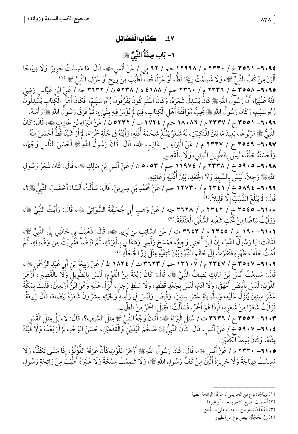 ٦١٠٥ - ٢٣٣٠ م / عَنْ أَنَسٍ - رضي الله عنه -، قَالَ: كَانَ رَسُولُ اللَّهِ - صلى الله عليه وسلم - أَزْهَرَ اللَّوْنِ، كَأَنَّ عَرَقَهُ اللُّؤْلُؤُ، إِذَا مَشَى تَكَفَّأَ، وَلَا مَسِسْتُ دِيبَاجَةً وَلَا حَرِيرَةً أَلْيَنَ مِنْ كَفِّ رَسُولِ اللَّهِ - صلى الله عليه وسلم -، وَلَا شَمِمْتُ مِسْكَةً وَلَا عَنْبَرَةً أَطْيَبَ مِنْ رَائِحَةِ رَسُولِ