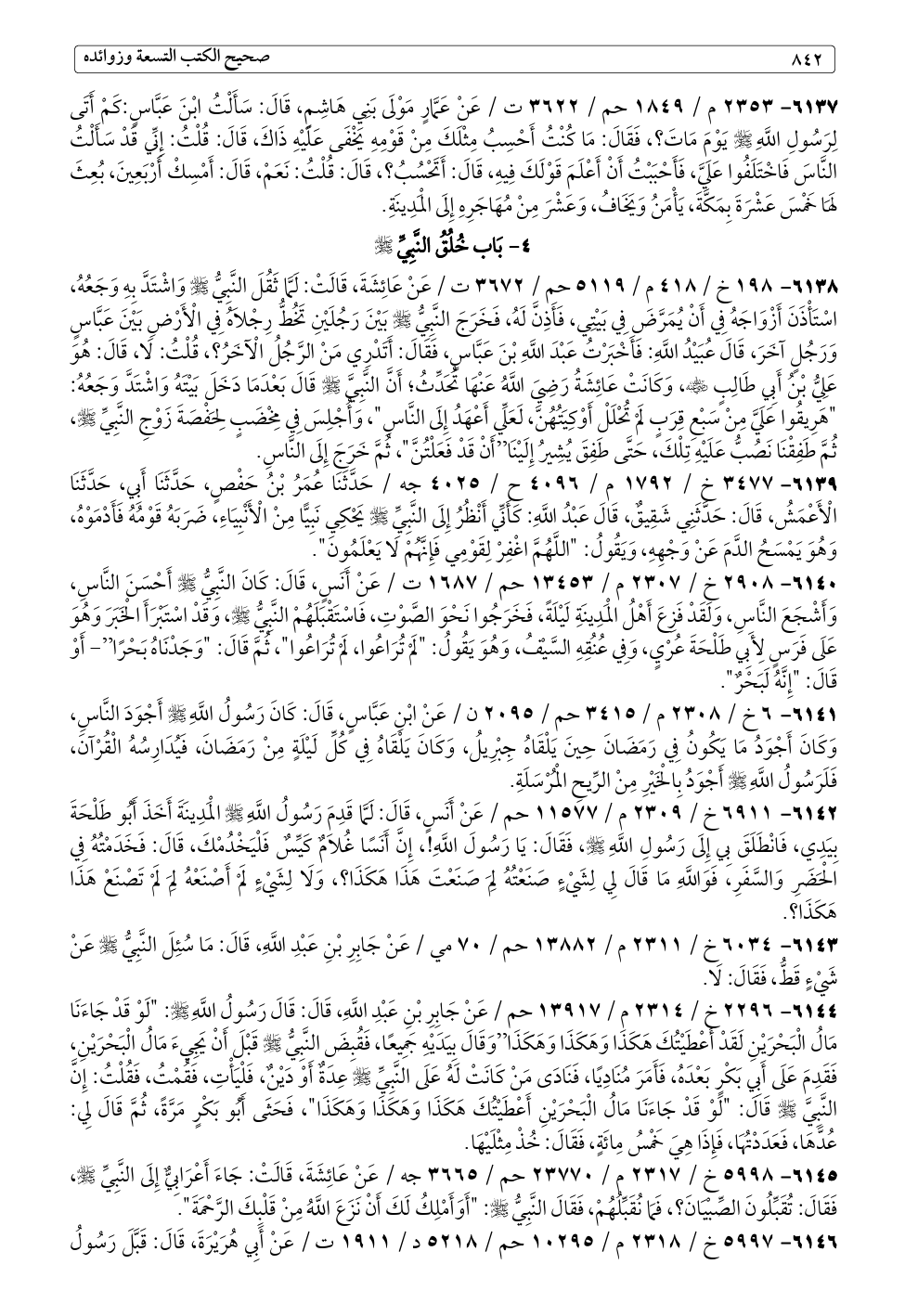 ٦١٣٨ - ١٩٨ خ / ٤١٨ م / ٥١١٩ حم / ٣٦٧٢ ت / عَنْ عَائِشَةَ، قَالَتْ: لَمَّا ثَقُلَ النَّبِيُّ - صلى الله عليه وسلم - وَاشْتَدَّ بِهِ وَجَعُهُ، اسْتَأْذَنَ أَزْوَاجَهُ فِي أَنْ يُمَرَّضَ فِي بَيْتِي، فَأَذِنَّ لَهُ، فَخَرَجَ النَّبِيُّ - صلى الله عليه وسلم - بَيْنَ رَجُلَيْنِ تَخُطُّ رِجْلَاهُ فِي الْأَرْضِ بَيْنَ عَبَّاسٍ وَرَجُلٍ آخَرَ، قَالَ عُبَيْدُ اللَّهِ: فَأَخْبَرْتُ عَبْدَ اللَّهِ بْنَ عَبَّاسٍ، فَقَالَ: أَتَدْرِي مَنْ الرَّجُلُ الْآخَرُ؟، قُلْتُ: لَا، قَالَ: هُوَ عَلِيُّ بْنُ أَبِي طَالِبٍ - رضي الله عنه -، وَكَانَتْ عَائِشَةُ رَضِيَ اللَّهُ عَنْهَا تُحَدِّثُ؛ أَنَّ النَّبِيَّ - صلى الله عليه وسلم - قَالَ بَعْدَمَا دَخَلَ بَيْتَهُ وَاشْتَدَّ وَجَعُهُ: "هَرِيقُوا عَلَيَّ مِنْ سَبْعِ قِرَبٍ لَمْ تُحْلَلْ أَوْكِيَتُهُنَّ، لَعَلِّي أَعْهَدُ إِلَى النَّاسِ"، وَأُجْلِسَ فِي مِخْضَبٍ لِحَفْصَةَ زَوْجِ النَّبِيِّ - صلى الله عليه وسلم -، ثُمَّ طَفِقْنَا نَصُبُّ عَلَيْهِ تِلْكَ، حَتَّى طَفِقَ يُشِيرُ إِلَيْنَا"أَنْ قَدْ فَعَلْتُنَّ"، ثُمَّ خَرَجَ إِلَى النَّاسِ.