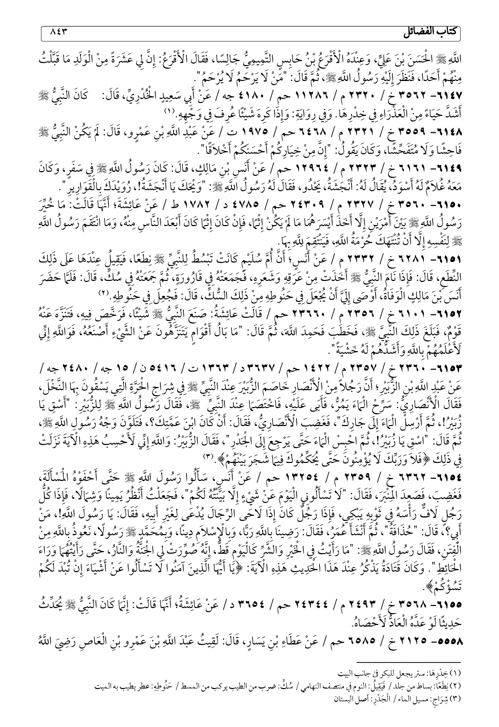 اللَّهِ - صلى الله عليه وسلم - الْحَسَنَ بْنَ عَلِيٍّ، وَعِنْدَهُ الْأَقْرَعُ بْنُ حَابِسٍ التَّمِيمِيُّ جَالِسًا، فَقَالَ الْأَقْرَعُ: إِنَّ لِي عَشَرَةً مِنْ الْوَلَدِ مَا قَبَّلْتُ مِنْهُمْ أَحَدًا، فَنَظَرَ إِلَيْهِ رَسُولُ اللَّهِ - صلى الله عليه وسلم -، ثُمَّ قَالَ: "مَنْ لَا يَرْحَمُ لَا يُرْحَمُ".