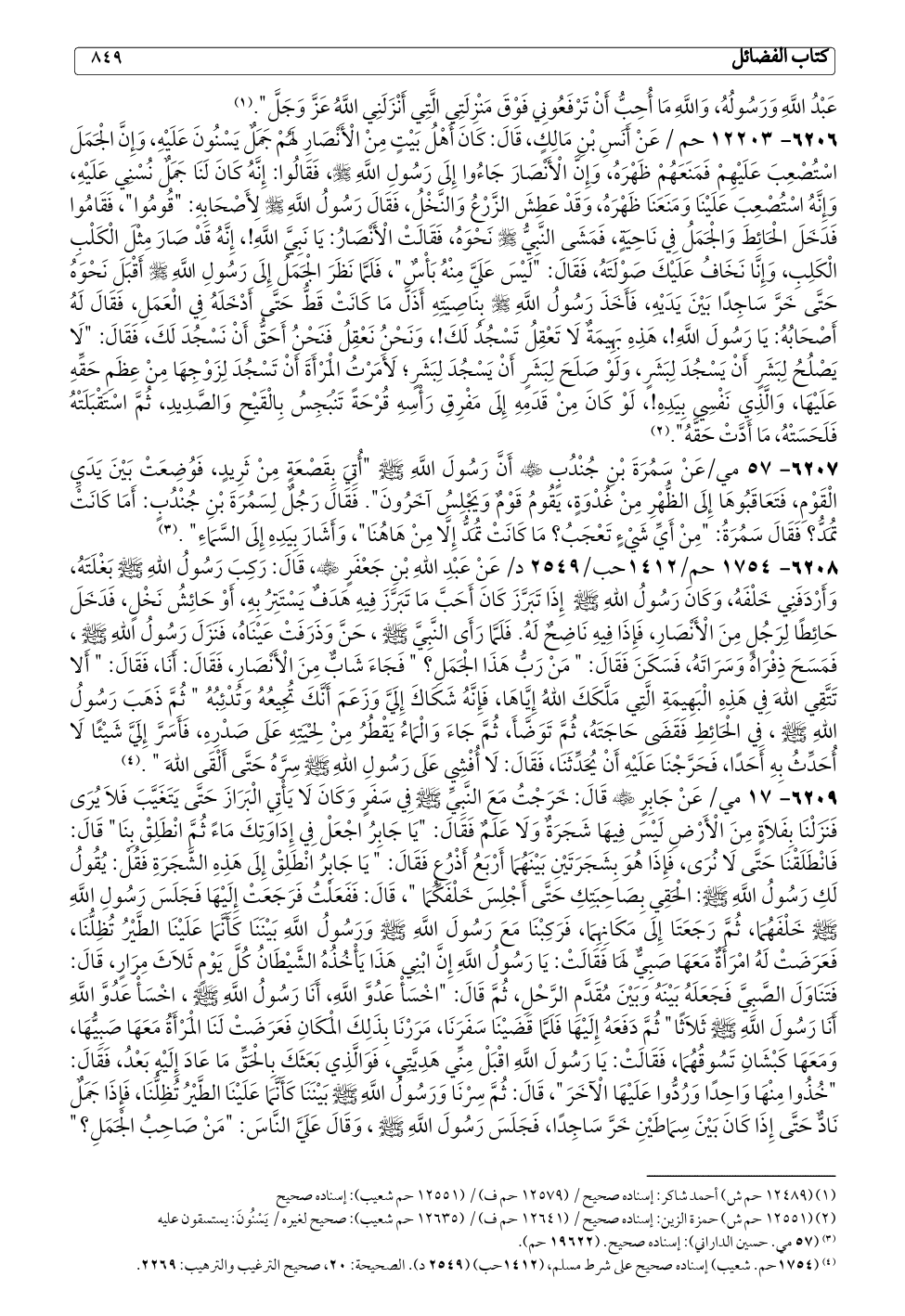٦٢٠٨ - ١٧٥٤ حم/١٤١٢ حب/٢٥٤٩ د/ عَنْ عَبْدِ اللهِ بْنِ جَعْفَرٍ - رضي الله عنه -، قَالَ: رَكِبَ رَسُولُ اللهِ - صلى الله عليه وسلم - بَغْلَتَهُ، وَأَرْدَفَنِي خَلْفَهُ، وَكَانَ رَسُولُ اللهِ - صلى الله عليه وسلم - إِذَا تَبَرَّزَ كَانَ أَحَبَّ مَا تَبَرَّزَ فِيهِ هَدَفٌ يَسْتَتِرُ بِهِ، أَوْ حَائِشُ نَخْلٍ، فَدَخَلَ حَائِطًا لِرَجُلٍ مِنَ الْأَنْصَارِ، فَإِذَا فِيهِ نَاضِحٌ لَهُ. فَلَمَّا رَأَى النَّبِيَّ - صلى الله عليه وسلم -، حَنَّ وَذَرَفَتْ عَيْنَاهُ، فَنَزَلَ رَسُولُ اللهِ - صلى الله عليه وسلم -، فَمَسَحَ ذِفْرَاهُ وَسَرَاتَهُ، فَسَكَنَ فَقَالَ: " مَنْ رَبُّ هَذَا الْجَمَلِ؟ " فَجَاءَ شَابٌّ مِنَ الْأَنْصَارِ، فَقَالَ: أَنَا، فَقَالَ: " أَلا تَتَّقِي اللهَ فِي هَذِهِ الْبَهِيمَةِ الَّتِي مَلَّكَكَ اللهُ إِيَّاهَا، فَإِنَّهُ شَكَاكَ إِلَيَّ وَزَعَمَ أَنَّكَ تُجِيعُهُ وَتُدْئِبُهُ " ثُمَّ ذَهَبَ رَسُولُ اللهِ - صلى الله عليه وسلم -، فِي الْحَائِطِ فَقَضَى حَاجَتَهُ، ثُمَّ تَوَضَّأَ، ثُمَّ جَاءَ وَالْمَاءُ يَقْطُرُ مِنْ لِحْيَتِهِ عَلَى صَدْرِهِ، فَأَسَرَّ إِلَيَّ شَيْئًا لَا أُحَدِّثُ بِهِ أَحَدًا، فَحَرَّجْنَا عَلَيْهِ أَنْ يُحَدِّثَنَا، فَقَالَ: لَا أُفْشِي عَلَى رَسُولِ اللهِ - صلى الله عليه وسلم - سِرَّهُ حَتَّى أَلْقَى اللهَ ". (¬٤)