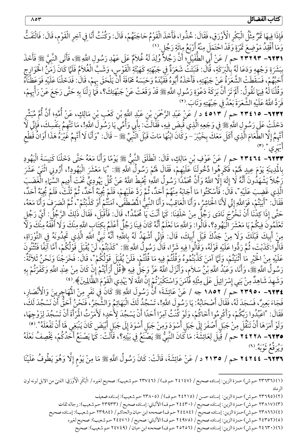 ٦٢٣٣ - ٢٣٤٦٤ حم / عَنْ عَوْفِ بْنِ مَالِكٍ، قَالَ: انْطَلَقَ النَّبِيُّ - صلى الله عليه وسلم - يَوْمًا وَأَنَا مَعَهُ حَتَّى دَخَلْنَا كَنِيسَةَ الْيَهُودِ بِالْمَدِينَةِ يَوْمَ عِيدٍ لَهُمْ، فَكَرِهُوا دُخُولَنَا عَلَيْهِمْ، فَقَالَ لَهُمْ رَسُولُ اللَّهِ - صلى الله عليه وسلم -: "يَا مَعْشَرَ الْيَهُودِ!، أَرُونِي اثْنَيْ عَشَرَ رَجُلًا يَشْهَدُونَ أَنَّهُ لَا إِلَهَ إِلَّا اللَّهُ وَأَنَّ مُحَمَّدًا رَسُولُ اللَّهِ؛ يُحْبِطْ اللَّهُ عَنْ كُلِّ يَهُودِيٍّ تَحْتَ أَدِيمِ السَّمَاءِ الْغَضَبَ الَّذِي غَضِبَ عَلَيْهِ"، قَالَ: فَأَسْكَتُوا مَا أَجَابَهُ مِنْهُمْ أَحَدٌ، ثُمَّ رَدَّ عَلَيْهِمْ، فَلَمْ يُجِبْهُ أَحَدٌ، ثُمَّ ثَلَّثَ، فَلَمْ يُجِبْهُ أَحَدٌ، فَقَالَ: "أَبَيْتُمْ، فَوَاللَّهِ إِنِّي لَأَنَا الْحَاشِرُ، وَأَنَا الْعَاقِبُ، وَأَنَا النَّبِيُّ الْمُصْطَفَى، آمَنْتُمْ أَوْ كَذَّبْتُمْ"، ثُمَّ انْصَرَفَ وَأَنَا مَعَهُ، حَتَّى إِذَا كِدْنَا أَنْ نَخْرُجَ نَادَى رَجُلٌ مِنْ خَلْفِنَا: كَمَا أَنْتَ يَا مُحَمَّدُ!، قَالَ: فَأَقْبَلَ، فَقَالَ ذَلِكَ الرَّجُلُ: أَيَّ رَجُلٍ تَعْلَمُونَ فِيكُمْ يَا مَعْشَرَ الْيَهُودِ؟، قَالُوا: وَاللَّهِ مَا نَعْلَمُ أَنَّهُ كَانَ فِينَا رَجُلٌ أَعْلَمُ بِكِتَابِ اللَّهِ مِنْكَ وَلَا أَفْقَهُ مِنْكَ وَلَا مِنْ أَبِيكَ قَبْلَكَ وَلَا مِنْ جَدِّكَ قَبْلَ أَبِيكَ، قَالَ: فَإِنِّي أَشْهَدُ لَهُ بِاللَّهِ؛ أَنَّهُ نَبِيُّ اللَّهِ الَّذِي تَجِدُونَهُ فِي التَّوْرَاةِ، قَالُوا: كَذَبْتَ، ثُمَّ رَدُّوا عَلَيْهِ قَوْلَهُ، وَقَالُوا فِيهِ شَرًّا، قَالَ رَسُولُ اللَّهِ - صلى الله عليه وسلم -: "كَذَبْتُمْ، لَنْ يُقْبَلَ قَوْلُكُمْ، أَمَّا آنِفًا فَتُثْنُونَ عَلَيْهِ مِنْ الْخَيْرِ مَا أَثْنَيْتُمْ، وَلَمَّا آمَنَ كَذَّبْتُمُوهُ وَقُلْتُمْ فِيهِ مَا
