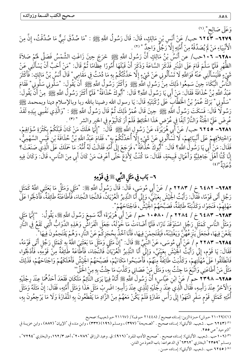 ٦٢٨٤ - ٢٢٨٣ م / عَنْ أَبِي مُوسَى، عَنْ النَّبِيِّ - صلى الله عليه وسلم - قَالَ: "إِنَّ مَثَلِي وَمَثَلَ مَا بَعَثَنِيَ اللَّهُ بِهِ كَمَثَلِ رَجُلٍ أَتَى قَوْمَهُ، فَقَالَ: يَا قَوْمِ، إِنِّي رَأَيْتُ الْجَيْشَ بِعَيْنَيَّ، وَإِنِّي أَنَا النَّذِيرُ الْعُرْيَانُ فَالنَّجَاءَ، فَأَطَاعَهُ طَائِفَةٌ مِنْ قَوْمِهِ، فَأَدْلَجُوا، فَانْطَلَقُوا عَلَى مُهْلَتِهِمْ، وَكَذَّبَتْ طَائِفَةٌ مِنْهُمْ، فَأَصْبَحُوا مَكَانَهُمْ، فَصَبَّحَهُمْ الْجَيْشُ فَأَهْلَكَهُمْ وَاجْتَاحَهُمْ، فَذَلِكَ مَثَلُ مَنْ أَطَاعَنِي وَاتَّبَعَ مَا جِئْتُ بِهِ، وَمَثَلُ مَنْ عَصَانِي وَكَذَّبَ مَا جِئْتُ بِهِ مِنْ الْحَقِّ"