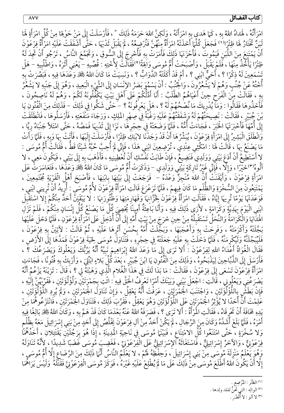 خَيْرًا، وَإِلَّا، فَإِنِّي غَيْرُ تَارِكَةٍ بَيْتِي وَوَلَدِي - وَذَكَرَتْ أُمُّ مُوسَى مَا كَانَ اللهُ - عز وجل - وَعَدَهَا، فَتَعَاسَرَتْ عَلَى امْرَأَةِ فِرْعَوْنَ، وَأَيْقَنَتْ أَنَّ اللهَ مُنْجِزٌ وَعْدَهُ - فَرَجَعَتْ إِلَى بَيْتِهَا بِابْنِهَا، فَأَصْبَحَ أَهْلُ الْقَرْيَةِ مُجْتَمِعِينَ، يَمْتَنِعُونَ مِنَ السُّخْرَةِ وَالظُّلْمِ مَا كَانَ فِيهِمْ، فَلَمَّا تَرَعْرَعَ قَالَتِ امْرَأَةُ فِرْعَوْنَ لأُمِّ مُوسَى: أُرِيدُ أَنْ تُرِينِي ابْنِي، فَوَعَدَتْهَا يَوْمًا تُرِيهَا إِيَّاهُ، فَقَالَتِ امْرَأَةُ فِرْعَوْنَ لِخُزَّانِهَا وَقَهَارِمَتِهَا وَظُئُورَتِهَا: لا يَبْقَيَنَّ أَحَدٌ مِنْكُمْ إِلا اسْتَقْبِلَ ابْنِي الْيَوْمَ بِهَدِيَّةٍ وَكَرَامَةٍ، لأَرَى ذَلِكَ فِيهِ، وَأَنَا بَاعِثَةٌ أَمِينًا يُحْصِيَ كُلَّ مَا يَصْنَعُ كُلُّ إِنْسَانٍ مِنْكُمْ، فَلَمْ تَزَلِ الْهَدَايَا وَالْكَرَامَةُ وَالنِّحَلُ تَسْتَقْبِلُهُ مِنْ حِينِ خَرَجَ مِنْ بَيْتِ أُمِّهِ إِلَى أَنْ أُدْخِلَ عَلَى امْرَأَةِ فِرْعَوْنِ، فَلَمَّا دَخَلَ عَلَيْهَا بَجَّلَتْهُ وَأَكْرَمَتْهُ، وَفَرِحَتْ بِهِ وَأَعْجَبَهَا، وَبَجَّلَتْ أُمَّهُ بِحُسْنِ أَثَرِهَا عَلَيْهِ، ثُمَّ قَالَتْ: لآتِيَنَّ بِهِ فِرْعَوْنَ، فَلَيُبَجِّلَنَّهُ وَلَيُكْرِمَنَّهُ، فَلَمَّا دَخَلَتْ بِهِ عَلَيْهِ جَعَلَتْهُ فِي حِجْرِهِ، فَتَنَاوَلَ مُوسَى لِحْيَةَ فِرْعَوْنَ فَمَدَّهَا إِلَى الأَرْضِ، فَقَالَ الْغُوَاةُ أَعْدَاءُ اللهِ لِفِرْعَوْنَ: أَلا تَرَى إِلَى مَا وَعَدَ اللهُ إِبْرَاهِيمَ نَبِيَّهُ أَنَّهُ يَرُبُّكَ وَيَعْلُوكَ وَيَصْرَعُكَ؟، فَأَرْسَلَ إِلَى الذَّبَّاحِينَ لِيَذْبَحُوهُ، وَذَلِكَ مِنَ الْفُتُونِ يَا ابْنَ جُبَيْرٍ، بَعْدَ كُلِّ بَلاءٍ ابْتُلِيَ، وَأَرْبِكْ بِهِ فُتُونًا، فَجَاءَتِ