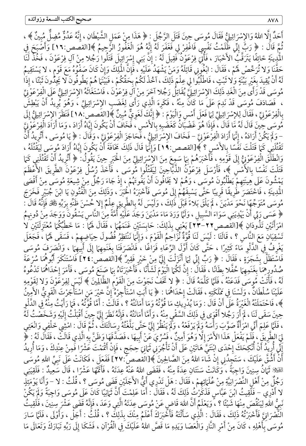 أَحَدٌ إِلَّا اللهُ وَالإِسْرَائِيلِيُّ فَقَالَ مُوسَى حِينَ قَتَلَ الرَّجُلَ: {هَذَا مِنْ عَمَلِ الشَّيْطَانِ، إِنَّهُ عَدُوٌّ مُضِلٌّ مُبِينٌ}، ثُمَّ قَالَ: {رَبِّ إِنِّي ظَلَمْتُ نَفْسِي فَاغْفِرْ لِي فَغَفَرَ لَهُ إِنَّهُ هُوَ الْغَفُورُ الرَّحِيمُ} [القصص:١٦] وَأَصْبَحَ فِي الْمَدِينَةِ خَائِفًا يَتَرَقَّبُ الأَخْبَارَ، فَأُتِيَ فِرْعَوْنُ فَقِيلَ لَهُ: إِنَّ بَنِي إِسْرَائِيلَ قَتَلُوا رَجُلا مِنْ آلِ فِرْعَوْنَ، فَخُذْ لَنَا حَقَّنَا وَلا تُرَخِّصْ لَهُمْ، فَقَالَ: ابْغُونِي قَاتِلَهُ وَمَنْ يَشْهَدُ عَلَيْهِ، فَإِنَّ الْمَلِكَ وَإِنْ كَانَ صَفْوُهُ مَعَ قَوْمٍ، لا يَسْتَقِيمُ لَهُ أَنْ يُقِيدَ بِغَيْرِ بَيِّنَةٍ وَلا ثَبْتٍ، فَاطْلُبُوا لِي عِلْمَ ذَلِكَ، آخُذْ لَكُمْ بِحَقِّكُمْ، فَبَيْنَمَا هُمْ يَطُوفُونَ لا يَجِدُونَ ثَبْتًا، إِذَا مُوسَى قَدْ رَأَى مِنَ الْغَدِ ذَلِكَ الإِسْرَائِيلِيَّ يُقَاتِلُ رَجُلا آخَرَ مِنْ آلِ فِرْعَوْنَ، فَاسْتَغَاثَهُ الإِسْرَائِيلِيُّ عَلَى الْفِرْعَوْنِيِّ، فَصَادَفَ مُوسَى قَدْ نَدِمَ عَلَى مَا كَانَ مِنْهُ، فَكَرِهَ الَّذِي رَأَى لِغَضَبِ الإِسْرَائِيلِيِّ، وَهُوَ يُرِيدُ أَنْ يَبْطِشَ بِالْفِرْعَوْنِيِّ، فَقَالَ لِلإِسْرَائِيلِيِّ لِمَا فَعَلَ أَمْسِ وَالْيَوْمَ: {إِنَّكَ لَغَوِيٌّ مُبِينٌ} [القصص:١٨] فَنَظَرَ الإِسْرَائِيلِيُّ إِلَى مُوسَى حِينَ قَالَ لَهُ مَا قَالَ، فَإِذَا هُوَ غَضْبَانُ كَغَضَبِهِ بِالأَمْسِ، فَخَافَ أَنْ يَكُونَ إِيَّاهُ أَرَادَ، وَمَا أَرَادَ الْفِرْعَوْنِيَّ - وَلَمْ يَكُنْ أَرَادَهُ، إِنَّمَا أَرَادَ الْفِرْعَوْنِيَّ - فَخَافَ الإِسْرَائِيلِيُّ، فَحَاجَزَ الْفِرْعَوْنِيَّ، وَقَالَ: {يَا مُوسَى، أَتُرِيدُ أَنْ تَقْتُلَنِي