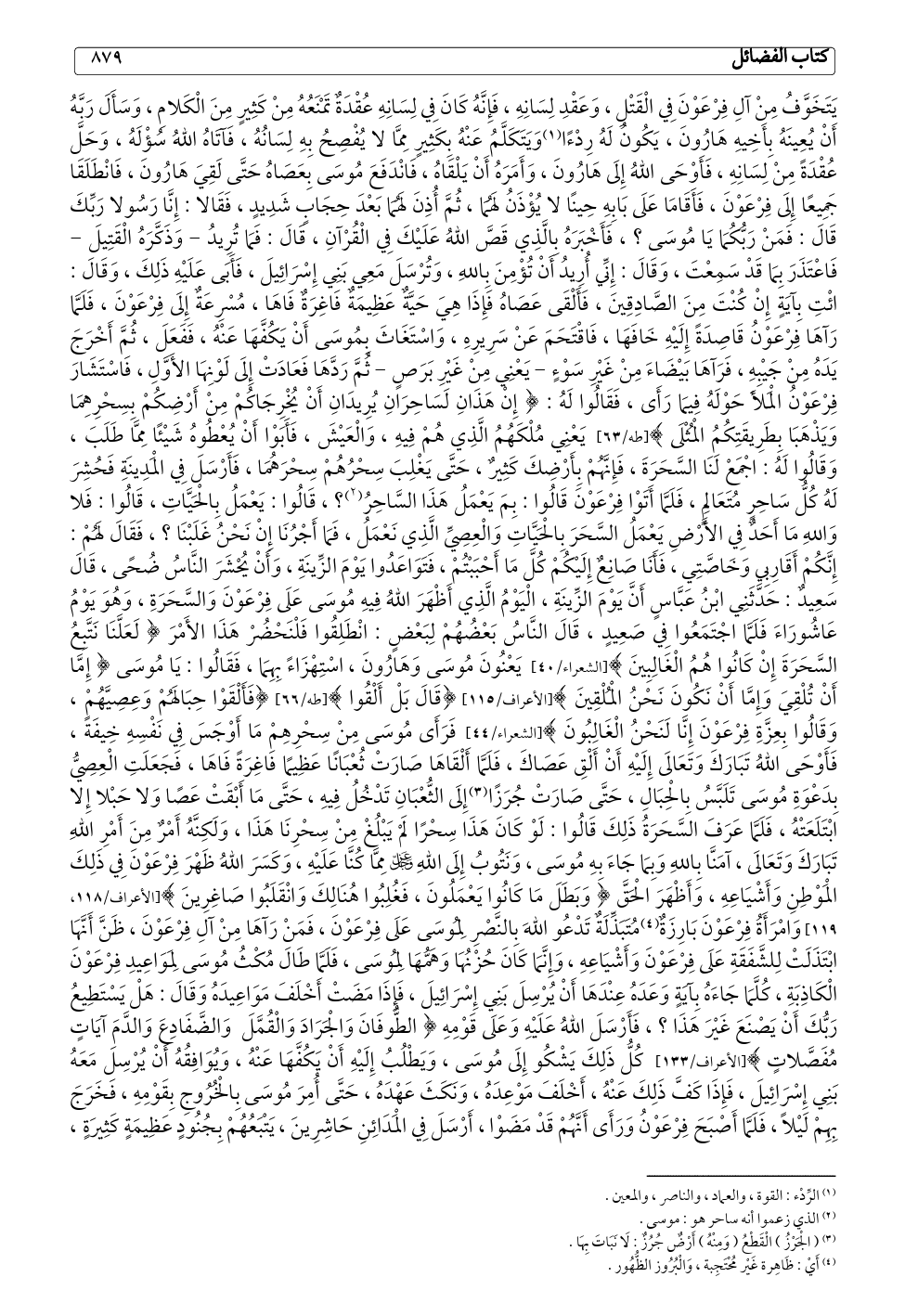وَيَتَكَلَّمُ عَنْهُ بِكَثِيرٍ مِمَّا لا يُفْصِحُ بِهِ لِسَانُهُ، فَآتَاهُ اللهُ سُؤْلَهُ، وَحَلَّ عُقْدَةً مِنْ لِسَانِهِ، فَأَوْحَى اللهُ إِلَى هَارُونَ، وَأَمَرَهُ أَنْ يَلْقَاهُ، فَانْدَفَعَ مُوسَى بِعَصَاهُ حَتَّى لَقِيَ هَارُونَ، فَانْطَلَقَا جَمِيعًا إِلَى فِرْعَوْنَ، فَأَقَامَا عَلَى بَابِهِ حِينًا لا يُؤْذَنُ لَهُمَا، ثُمَّ أُذِنَ لَهُمَا بَعْدَ حِجَابٍ شَدِيدٍ، فَقَالا: إِنَّا رَسُولا رَبِّكَ قَالَ: فَمَنْ رَبُّكُمَا يَا مُوسَى؟، فَأَخْبَرَهُ بِالَّذِي قَصَّ اللهُ عَلَيْكَ فِي الْقُرْآنِ، قَالَ: فَمَا تُرِيدُ - وَذَكَّرَهُ الْقَتِيلَ - فَاعْتَذَرَ بِمَا قَدْ سَمِعْتَ، وَقَالَ: إِنِّي أُرِيدُ أَنْ تُؤْمِنَ بِاللهِ، وَتُرْسَلَ مَعِي بَنِي إِسْرَائِيلَ، فَأَبَى عَلَيْهِ ذَلِكَ، وَقَالَ: ائْتِ بِآيَةٍ إِنْ كُنْتَ مِنَ الصَّادِقِينَ، فَأَلْقَى عَصَاهُ فَإِذَا هِيَ حَيَّةٌ عَظِيمَةٌ فَاغِرَةٌ فَاهَا، مُسْرِعَةٌ إِلَى فِرْعَوْنَ، فَلَمَّا رَأَىهَا فِرْعَوْنُ قَاصِدَةً إِلَيْهِ خَافَهَا، فَاقْتَحَمَ عَنْ سَرِيرِهِ، وَاسْتَغَاثَ بِمُوسَى أَنْ يَكُفَّهَا عَنْهُ، فَفَعَلَ، ثُمَّ أَخْرَجَ يَدَهُ مِنْ جَيْبِهِ، فَرَأَىهَا بَيْضَاءَ مِنْ غَيْرِ سَوْءٍ - يَعْنِي مِنْ غَيْرِ بَرَصٍ - ثُمَّ رَدَّهَا فَعَادَتْ إِلَى لَوْنِهَا الأَوَّلِ، فَاسْتَشَارَ فِرْعَوْنُ الْمَلأَ حَوْلَهُ فِيمَا رَأَى، فَقَالُوا لَهُ: {إِنْ هَذَانِ لَسَاحِرَانِ يُرِيدَانِ أَنْ يُخْرِجَاكُمْ مِنْ أَرْضِكُمْ بِسِحْرِهِمَا وَيَذْهَبَا بِطَرِيقَتِكُمُ الْمُثْلَى} [طه/٦٣] يَعْنِي مُلْكَهُمُ الَّذِي هُمْ فِيهِ، وَالْعَيْشَ، فَأَبَوْا أَنْ يُعْطُوهُ شَيْئًا مِمَّا طَلَبَ، وَقَالُوا لَهُ: اجْمَعْ لَنَا السَّحَرَةَ، فَإِنَّهُمْ بِأَرْضِكَ كَثِيرٌ، حَتَّى يَغْلِبَ