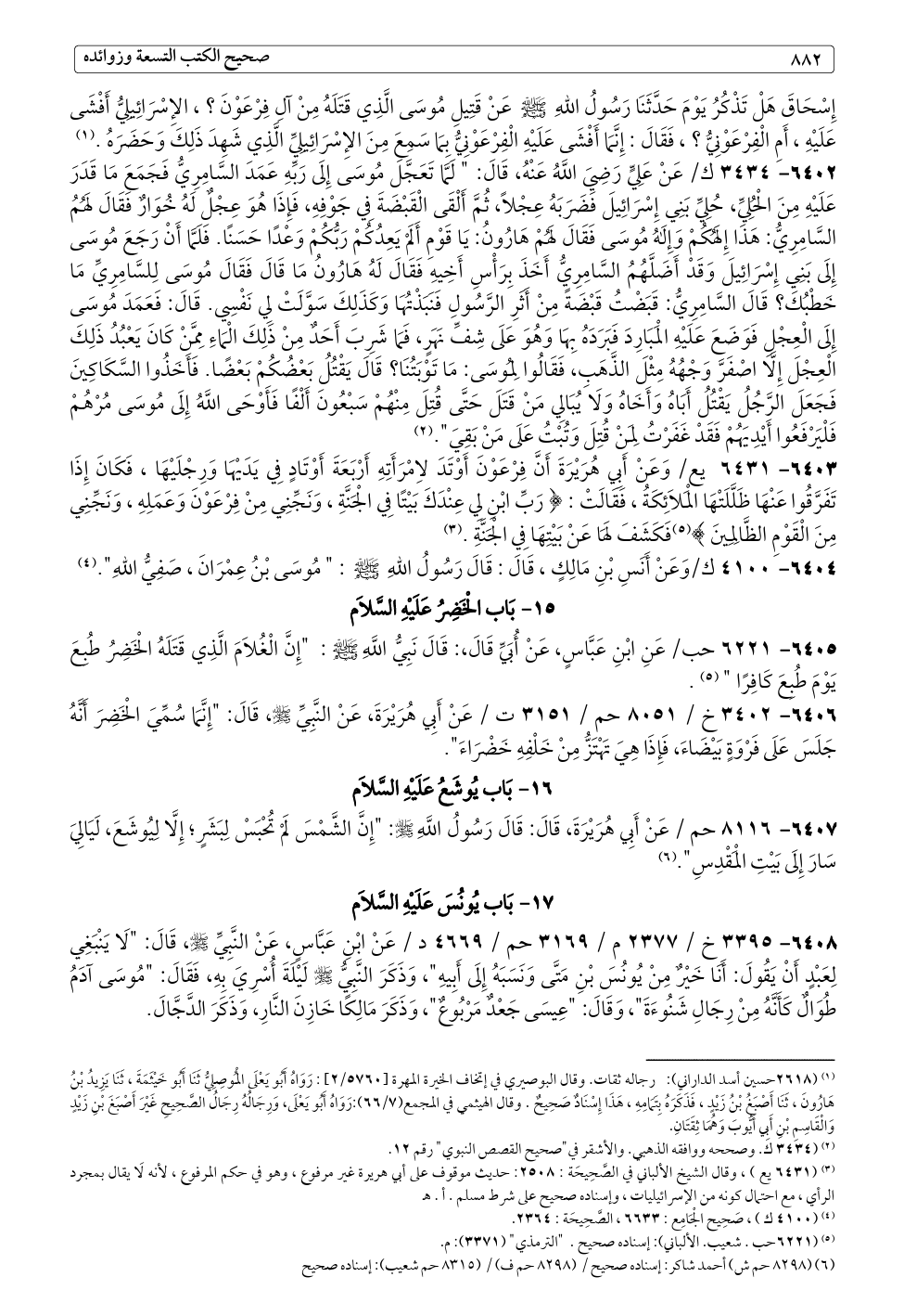 ٦٤٠٨ - ٣٣٩٥ خ / ٢٣٧٧ م / ٣١٦٩ حم / ٤٦٦٩ د / عَنْ ابْنِ عَبَّاسٍ، عَنْ النَّبِيِّ - صلى الله عليه وسلم -، قَالَ: "لَا يَنْبَغِي لِعَبْدٍ أَنْ يَقُولَ: أَنَا خَيْرٌ مِنْ يُونُسَ بْنِ مَتَّى وَنَسَبَهُ إِلَى أَبِيهِ"، وَذَكَرَ النَّبِيُّ - صلى الله عليه وسلم - لَيْلَةَ أُسْرِيَ بِهِ، فَقَالَ: "مُوسَى آدَمُ طُوَالٌ كَأَنَّهُ مِنْ رِجَالِ شَنُوءَةَ"، وَقَالَ: "عِيسَى جَعْدٌ مَرْبُوعٌ"، وَذَكَرَ مَالِكًا خَازِنَ النَّارِ، وَذَكَرَ الدَّجَّالَ.