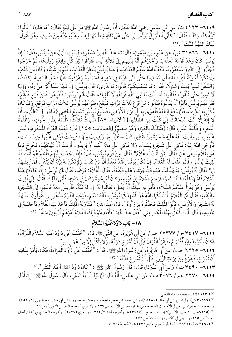 ٦٤٠٩ - ٤١٢٣ ك/ عَنِ ابْنِ عَبَّاسٍ رَضِيَ اللَّهُ عَنْهُمَا، أَنَّ رَسُولَ اللَّهِ - صلى الله عليه وسلم - مَرَّ عَلَى ثَنِيَّةٍ فَقَالَ: "مَا هَذِهِ؟ " قَالُوا: ثَنِيَّةُ كَذَا وَكَذَا، فَقَالَ: " كَأَنِّي أَنْظُرُ إِلَى يُونُسَ بْنِ مَتَّى عَلَى نَاقَةٍ خِطَامُهَا لِيفٌ وَعَلَيْهِ جُبَّةٌ مِنْ صُوفٍ وَهُوَ يَقُولُ: لَبَّيْكَ اللَّهُمَّ لَبَّيْكَ". (¬١)