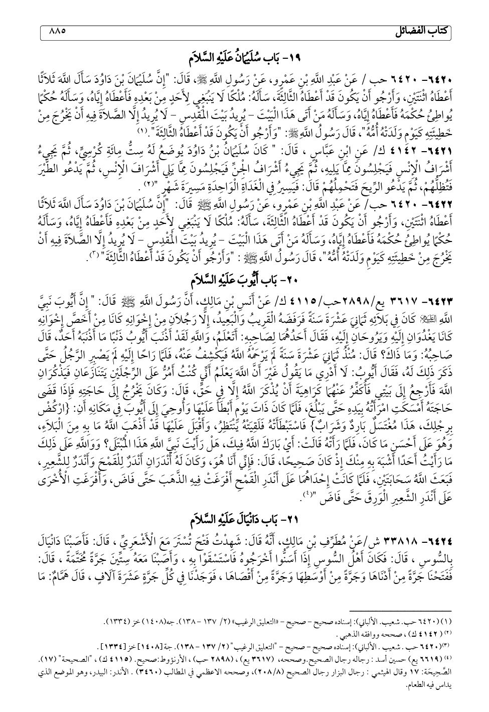 ٦٤٢٢ - ٦٤٢٠ حب/ عَنْ عَبْدِ اللَّهِ بْنِ عَمْرٍو، عَنْ رَسُولِ اللَّهِ - صلى الله عليه وسلم - قَالَ: "إِنَّ سُلَيْمَانَ بْنَ دَاوُدَ سَأَلَ اللَّهَ ثَلَاثًا أَعْطَاهُ اثْنَتَيْنِ، وَأَرْجُو أَنْ يَكُونَ قَدْ أَعْطَاهُ الثَّالِثَةَ، سَأَلَهُ: مُلْكًا لَا يَنْبَغِي لِأَحَدٍ مِنْ بَعْدِهِ فَأَعْطَاهُ إِيَّاهُ، وَسَأَلَهُ حُكْمًا يُواطِئُ حُكْمَهُ فَأَعْطَاهُ إِيَّاهُ، وَسَأَلَهُ مَنْ أَتَى هَذَا الْبَيْتَ - يُرِيدُ بَيْتَ الْمَقْدِسِ - لَا يُرِيدُ إِلَّا الصَّلَاةَ فِيهِ أَنْ يَخْرُجَ مِنْ خَطِيئَتِهِ كَيَوْمِ وَلَدَتْهُ أُمُّهُ"، قَالَ رَسُولُ اللَّهِ - صلى الله عليه وسلم -: "وَأَرْجُو أَنْ يَكُونَ قَدْ أَعْطَاهُ الثَّالِثَةَ" (¬٣).