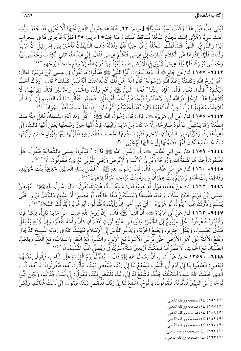 ٦٤٤٧ - ٤١٦٣ ك/ عَنْ أَبِي هُرَيْرَةَ - رضي الله عنه -، أَنَّ النَّبِيَّ - صلى الله عليه وسلم - قَالَ: "إِنَّ رُوحَ اللَّهِ عِيسَى ابْنَ مَرْيَمَ نَازِلٌ فِيكُمْ فَإِذَا رَأَيْتُمُوهُ فَاعْرِفُوهُ رَجُلٌ مَرْبُوعٌ إِلَى الْحُمْرَةِ وَالْبَيَاضِ عَلَيْهِ ثَوْبَانِ مُمَصَّرَانِ كَأَنَّ رَأْسَهُ يَقْطُرُ، وَإِنْ لَمْ يُصِبْهُ بَلَلٌ فَيَدُقُّ الصَّلِيبَ، وَيَقْتُلُ الْخِنْزِيرَ، وَيَضَعُ الْجِزْيَةَ، وَيَدْعُو النَّاسَ إِلَى الْإِسْلَامِ فَيُهْلِكُ اللَّهُ فِي زَمَانِهِ الْمَسِيحَ الدَّجَّالَ وَتَقَعُ الْأَمَنَةُ عَلَى أَهْلِ الْأَرْضِ حَتَّى تَرْعَى الْأَسْوَدُ مَعَ الْإِبِلِ، وَالنُّمُورُ مَعَ الْبَقَرِ وَالذِّئَابُ، مَعَ الْغَنَمِ وَيَلْعَبُ الصِّبْيَانُ مَعَ الْحَيَّاتِ، لَا تَضُرُّهُمْ فَيَمْكُثُ أَرْبَعِينَ سَنَةً، ثُمَّ يُتَوَفَّى وَيُصَلِّي عَلَيْهِ الْمُسْلِمُونَ " (¬٧).