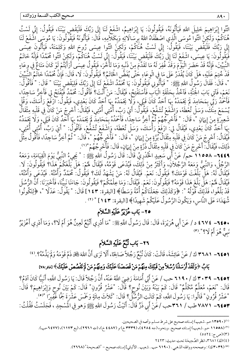 ائْتُوا إِبْرَاهِيمَ خَلِيلَ اللهِ فَيَأْتُونَهُ، فَيَقُولُونَ: يَا إِبْرَاهِيمُ، اشْفَعْ لَنَا إِلَى رَبِّكَ فَلْيَقْضِ بَيْنَنَا، فَيَقُولُ: إِنِّي لَسْتُ هُنَاكُمْ، وَلَكِنْ ائْتُوا مُوسَى الَّذِي اصْطَفَاهُ اللهُ بِرِسَالَاتِهِ وَبِكَلَامِهِ، قَالَ: فَيَأْتُونَهُ فَيَقُولُونَ: يَا مُوسَى اشْفَعْ لَنَا إِلَى رَبِّكَ فَلْيَقْضِ بَيْنَنَا، فَيَقُولُ: إِنِّي لَسْتُ هُنَاكُمْ، وَلَكِنْ ائْتُوا عِيسَى رُوحَ اللهِ وَكَلِمَتَهُ، فَيَأْتُونَ عِيسَى فَيَقُولُونَ: يَا عِيسَى، اشْفَعْ لَنَا إِلَى رَبِّكَ فَلْيَقْضِ بَيْنَنَا، فَيَقُولُ: إِنِّي لَسْتُ هُنَاكُمْ، وَلَكِنْ ائْتُوا مُحَمَّدًا فَإِنَّهُ خَاتَمُ النَّبِيِّينَ، فَإِنَّهُ قَدْ حَضَرَ الْيَوْمَ وَقَدْ غُفِرَ لَهُ مَا تَقَدَّمَ مِنْ ذَنْبِهِ وَمَا تَأَخَّرَ، فَيَقُولُ عِيسَى أَرَأَيْتُمْ لَوْ كَانَ مَتَاعٌ فِي وِعَاءٍ قَدْ خُتِمَ عَلَيْهِ، هَلْ كَانَ يُقْدَرُ عَلَى مَا فِي الْوِعَاءِ حَتَّى يُفَضَّ الْخَاتَمُ؟ فَيَقُولُونَ: لَا، قَالَ: فَإِنَّ مُحَمَّدًا خَاتَمُ النَّبِيِّينَ "، قَالَ: فَقَالَ رَسُولُ
