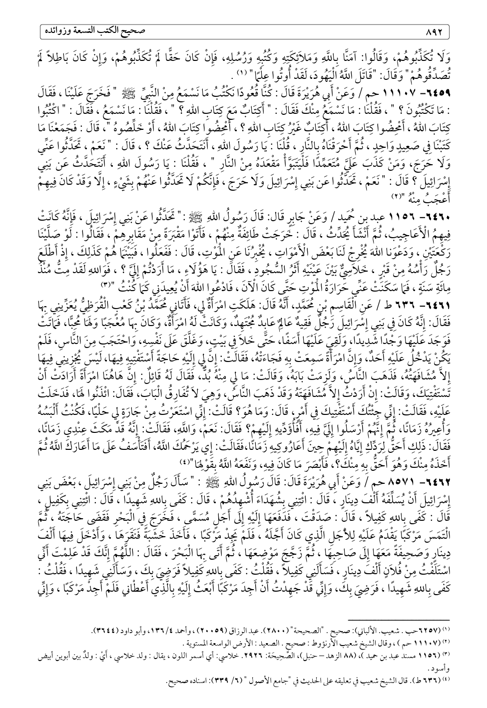 ٦٤٥٩ - ١١١٠٧ حم / وَعَنْ أَبِي هُرَيْرَةَ قَالَ: كُنَّا قُعُودًا نَكْتُبُ مَا نَسْمَعُ مِنْ النَّبِيِّ - صلى الله عليه وسلم - " فَخَرَجَ عَلَيْنَا، فَقَالَ: مَا تَكْتُبُونَ؟ "، فَقُلْنَا: مَا نَسْمَعُ مِنْكَ فَقَالَ: " أَكِتَابٌ مَعَ كِتَابِ اللهِ؟ "، فَقُلْنَا: مَا نَسْمَعُ، فَقَالَ: " اكْتُبُوا كِتَابَ اللهُ، أَمْحِضُوا كِتَابَ اللهُ، أَكِتَابٌ غَيْرُ كِتَابِ اللهِ؟، أَمْحِضُوا كِتَابَ اللهُ، أَوْ خَلِّصُوهُ "، قَالَ: فَجَمَعْنَا مَا كَتَبْنَا فِي صَعِيدٍ وَاحِدٍ، ثُمَّ أَحْرَقْنَاهُ بِالنَّارِ، قُلْنَا: يَا رَسُولَ اللهِ، أَنَتَحَدَّثُ عَنْكَ؟، قَالَ: " نَعَمْ، تَحَدَّثُوا عَنِّي وَلَا حَرَجَ، وَمَنْ كَذَبَ عَلَيَّ مُتَعَمِّدًا فَلْيَتَبَوَّأْ مَقْعَدَهُ مِنْ النَّارِ "، فَقُلْنَا: يَا رَسُولَ اللهِ، أَنَتَحَدَّثُ عَن بَنِي إِسْرَائِيلَ؟ قَالَ: " نَعَمْ، تَحَدَّثُوا عَن بَنِي إِسْرَائِيلَ وَلَا حَرَجَ، فَإِنَّكُمْ لَا تَحَدَّثُوا عَنْهُمْ بِشَيْءٍ، إِلَّا وَقَدْ كَانَ فِيهِمْ أَعْجَبُ مِنْهُ " (¬٢)