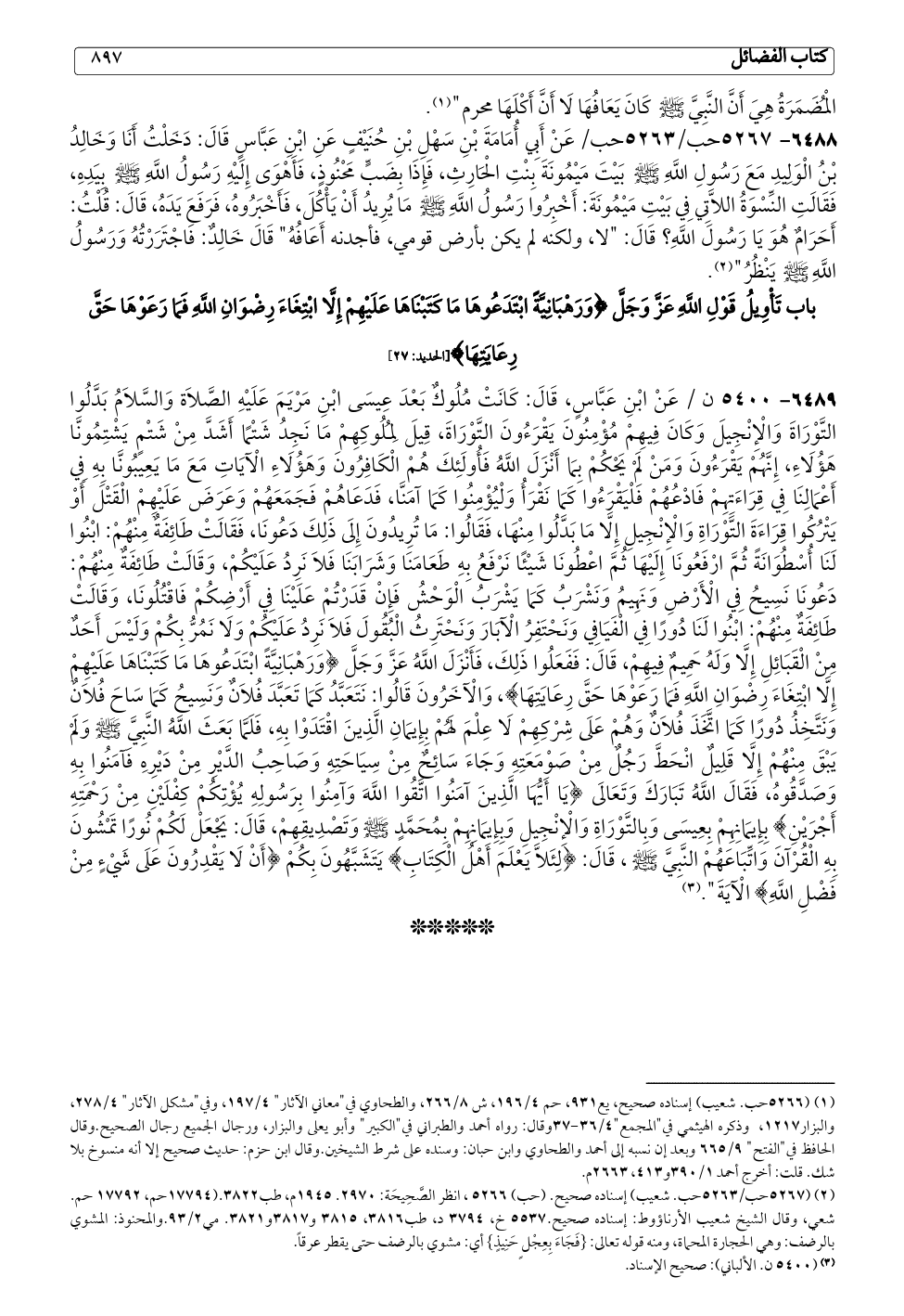 باب تَأْوِيلُ قَوْلِ اللَّهِ عَزَّ وَجَلَّ {وَرَهْبَانِيَّةً ابْتَدَعُوهَا مَا كَتَبْنَاهَا عَلَيْهِمْ إِلَّا ابْتِغَاءَ رِضْوَانِ اللَّهِ فَمَا رَعَوْهَا حَقَّ رِعَايَتِهَا} [الحديد: ٢٧]