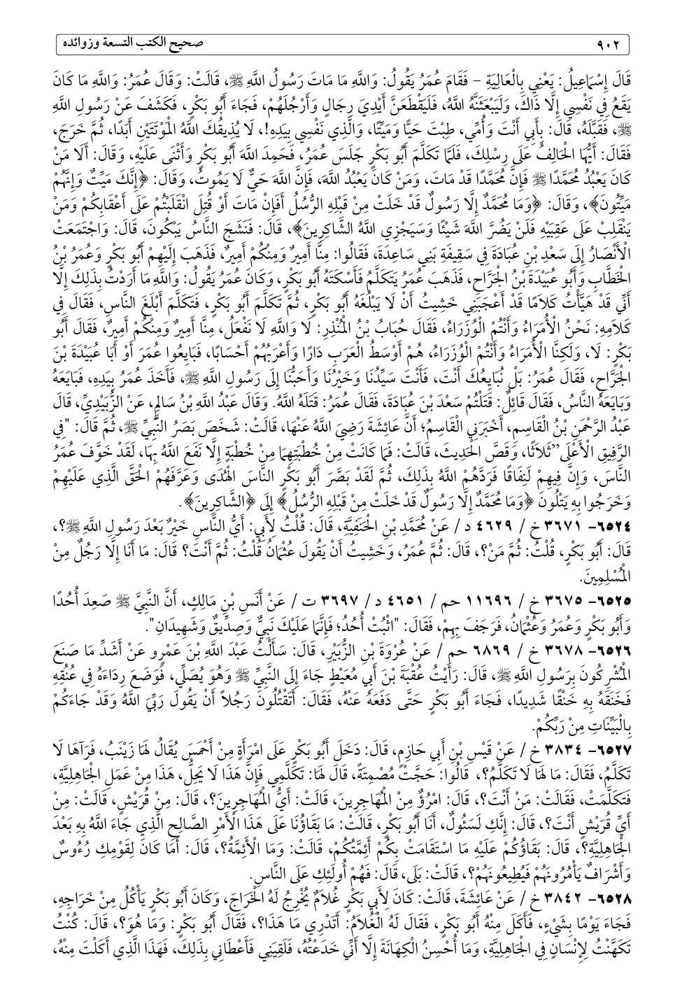 ٦٥٢٧ - ٣٨٣٤ خ / عَنْ قَيْسِ بْنِ أَبِي حَازِمٍ، قَالَ: دَخَلَ أَبُو بَكْرٍ عَلَى امْرَأَةٍ مِنْ أَحْمَسَ يُقَالُ لَهَا زَيْنَبُ، فَرَأَىهَا لَا تَكَلَّمُ، فَقَالَ: مَا لَهَا لَا تَكَلَّمُ؟، قَالُوا: حَجَّتْ مُصْمِتَةً، قَالَ لَهَا: تَكَلَّمِي فَإِنَّ هَذَا لَا يَحِلُّ، هَذَا مِنْ عَمَلِ الْجَاهِلِيَّةِ، فَتَكَلَّمَتْ، فَقَالَتْ: مَنْ أَنْتَ؟، قَالَ: امْرُؤٌ مِنْ الْمُهَاجِرِينَ، قَالَتْ: أَيُّ الْمُهَاجِرِينَ؟، قَالَ: مِنْ قُرَيْشٍ، قَالَتْ: مِنْ أَيِّ قُرَيْشٍ أَنْتَ؟، قَالَ: إِنَّكِ لَسَئُولٌ، أَنَا أَبُو بَكْرٍ، قَالَتْ: مَا بَقَاؤُنَا عَلَى هَذَا الْأَمْرِ الصَّالِحِ الَّذِي جَاءَ اللَّهُ بِهِ بَعْدَ الْجَاهِلِيَّةِ؟، قَالَ: بَقَاؤُكُمْ عَلَيْهِ مَا اسْتَقَامَتْ بِكُمْ أَئِمَّتُكُمْ، قَالَتْ: وَمَا الْأَئِمَّةُ؟، قَالَ: أَمَا كَانَ لِقَوْمِكِ رُءُوسٌ وَأَشْرَافٌ يَأْمُرُونَهُمْ فَيُطِيعُونَهُمْ؟، قَالَتْ: بَلَى، قَالَ: فَهُمْ أُولَئِكِ عَلَى النَّاسِ.