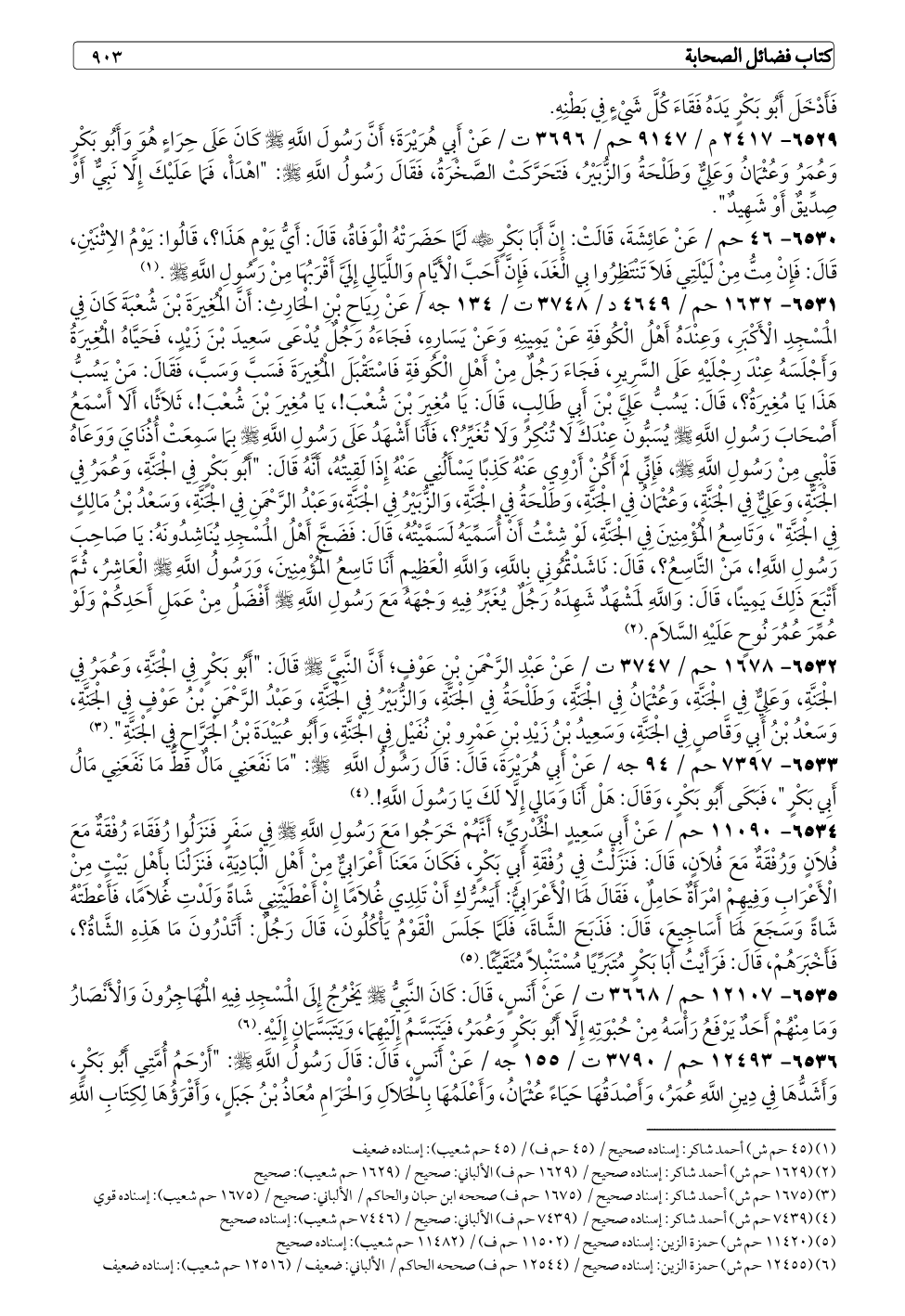٦٥٢٩ - ٢٤١٧ م / ٩١٤٧ حم / ٣٦٩٦ ت / عَنْ أَبِي هُرَيْرَةَ؛ أَنَّ رَسُولَ اللَّهِ - صلى الله عليه وسلم - كَانَ عَلَى حِرَاءٍ هُوَ وَأَبُو بَكْرٍ وَعُمَرُ وَعُثْمَانُ وَعَلِيٌّ وَطَلْحَةُ وَالزُّبَيْرُ، فَتَحَرَّكَتْ الصَّخْرَةُ، فَقَالَ رَسُولُ اللَّهِ - صلى الله عليه وسلم -: "اهْدَأْ، فَمَا عَلَيْكَ إِلَّا نَبِيٌّ أَوْ صِدِّيقٌ أَوْ شَهِيدٌ".