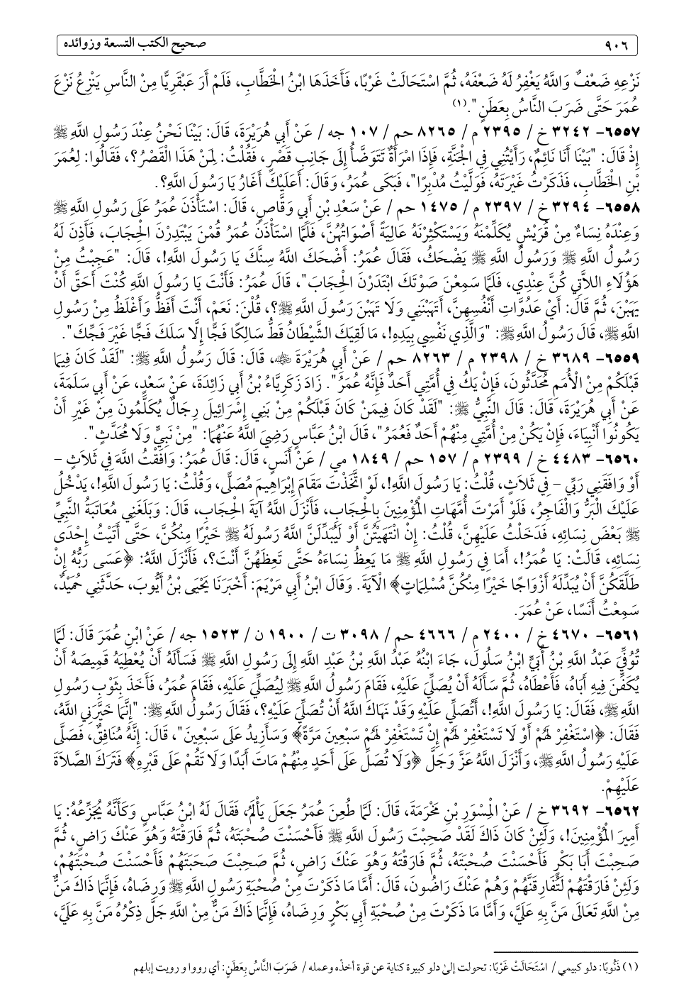 ٦٥٥٩ - ٣٦٨٩ خ / ٢٣٩٨ م / ٨٢٦٣ حم / عَنْ أَبِي هُرَيْرَةَ - رضي الله عنه -، قَالَ: قَالَ رَسُولُ اللَّهِ - صلى الله عليه وسلم -: "لَقَدْ كَانَ فِيمَا قَبْلَكُمْ مِنْ الْأُمَمِ مُحَدَّثُونَ، فَإِنْ يَكُ فِي أُمَّتِي أَحَدٌ فَإِنَّهُ عُمَرُ". زَادَ زَكَرِيَّاءُ بْنُ أَبِي زَائِدَةَ، عَنْ سَعْدٍ، عَنْ أَبِي سَلَمَةَ، عَنْ أَبِي هُرَيْرَةَ، قَالَ: قَالَ النَّبِيُّ - صلى الله عليه وسلم -: "لَقَدْ كَانَ فِيمَنْ كَانَ قَبْلَكُمْ مِنْ بَنِي إِسْرَائِيلَ رِجَالٌ يُكَلَّمُونَ مِنْ غَيْرِ أَنْ يَكُونُوا أَنْبِيَاءَ، فَإِنْ يَكُنْ مِنْ أُمَّتِي مِنْهُمْ أَحَدٌ فَعُمَرُ"، قَالَ ابْنُ عَبَّاسٍ رَضِيَ اللَّهُ عَنْهُمَا: "مِنْ نَبِيٍّ وَلَا مُحَدَّثٍ".