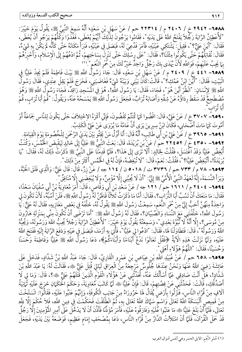 ٦٥٨٨ - ٢٩٤٢ خ / ٢٤٠٦ م / ٢٢٣١٤ حم / عَنْ سَهْلِ بْنِ سَعْدٍ؛ أَنَّهُ سَمِعَ النَّبِيَّ - صلى الله عليه وسلم -، يَقُولُ يَوْمَ خَيْبَرَ: "لَأُعْطِيَنَّ الرَّايَةَ رَجُلًا يَفْتَحُ اللَّهُ عَلَى يَدَيْهِ"، فَقَامُوا يَرْجُونَ لِذَلِكَ أَيُّهُمْ يُعْطَى، فَغَدَوْا وَكُلُّهُمْ يَرْجُو أَنْ يُعْطَى، فَقَالَ: "أَيْنَ عَلِيٌّ؟ "، فَقِيلَ: يَشْتَكِي عَيْنَيْهِ، فَأَمَرَ فَدُعِيَ لَهُ، فَبَصَقَ فِي عَيْنَيْهِ، فَبَرَأَ مَكَانَهُ حَتَّى كَأَنَّه لَمْ يَكُنْ بِهِ شَيْءٌ، فَقَالَ: نُقَاتِلُهُمْ حَتَّى يَكُونُوا مِثْلَنَا؟، فَقَالَ: "عَلَى رِسْلِكَ حَتَّى تَنْزِلَ بِسَاحَتِهِمْ، ثُمَّ ادْعُهُمْ إِلَى الْإِسْلَامِ، وَأَخْبِرْهُمْ بِمَا يَجِبُ عَلَيْهِمْ، فَوَاللَّهِ لَأَنْ يُهْدَى بِكَ رَجُلٌ وَاحِدٌ خَيْرٌ لَكَ مِنْ حُمْرِ النَّعَمِ". (¬١)