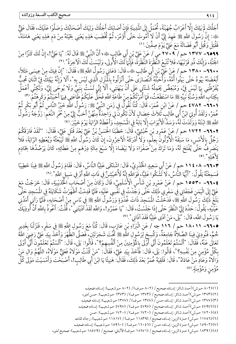 ٦٦٠٥ - ١٨٠١١ حم / ١١٦ جه / عَنِ الْبَرَاءِ بْنِ عَازِبٍ، قَالَ: كُنَّا مَعَ رَسُولِ اللَّهِ - صلى الله عليه وسلم - فِي سَفَرٍ، فَنَزَلْنَا بِغَدِيرِ خُمٍّ، فَنُودِيَ فِينَا الصَّلَاةُ جَامِعَةٌ، وَكُسِحَ لِرَسُولِ اللَّهِ - صلى الله عليه وسلم - تَحْتَ شَجَرَتَيْنِ، فَصَلَّى الظُّهْرَ وَأَخَذَ بِيَدِ عَلِيٍّ رَضِيَ اللَّهُ تَعَالَى عَنْهُ، فَقَالَ: "أَلَسْتُمْ تَعْلَمُونَ أَنِّي أَوْلَى بِالْمُؤْمِنِينَ مِنْ أَنْفُسِهِمْ؟ "، قَالُوا: بَلَى، قَالَ: "أَلَسْتُمْ تَعْلَمُونَ أَنِّي أَوْلَى بِكُلِّ مُؤْمِنٍ مِنْ نَفْسِهِ؟ "، قَالُوا: بَلَى، قَالَ: فَأَخَذَ بِيَدِ عَلِيٍّ، فَقَالَ: "مَنْ كُنْتُ مَوْلَاهُ فَعَلِيٌّ مَوْلَاهُ، اللَّهُمَّ وَالِ مَنْ وَالَاهُ وَعَادِ مَنْ عَادَاهُ"، قَالَ: فَلَقِيَهُ عُمَرُ بَعْدَ ذَلِكَ، فَقَالَ: هَنِيئًا يَا ابْنَ أَبِي طَالِبٍ!، أَصْبَحْتَ وَأَمْسَيْتَ مَوْلَى كُلِّ مُؤْمِنٍ وَمُؤْمِنَةٍ. (¬٨)