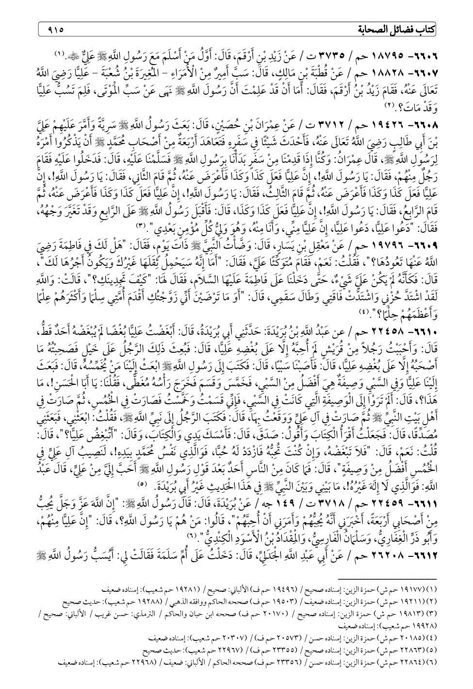 ٦٦٠٨ - ١٩٤٢٦ حم / ٣٧١٢ ت / عَنْ عِمْرَانَ بْنِ حُصَيْنٍ، قَالَ: بَعَثَ رَسُولُ اللَّهِ - صلى الله عليه وسلم - سَرِيَّةً وَأَمَّرَ عَلَيْهِمْ عَلِيَّ بْنَ أَبِي طَالِبٍ رَضِيَ اللَّهُ تَعَالَى عَنْهُ، فَأَحْدَثَ شَيْئًا فِي سَفَرِهِ فَتَعَاهَدَ أَرْبَعَةٌ مِنْ أَصْحَابِ مُحَمَّدٍ - صلى الله عليه وسلم - أَنْ يَذْكُرُوا أَمْرَهُ لِرَسُولِ اللَّهِ - صلى الله عليه وسلم -، قَالَ عِمْرَانُ: وَكُنَّا إِذَا قَدِمْنَا مِنْ سَفَرٍ بَدَأْنَا بِرَسُولِ اللَّهِ - صلى الله عليه وسلم - فَسَلَّمْنَا عَلَيْهِ، قَالَ: فَدَخَلُوا عَلَيْهِ فَقَامَ رَجُلٌ مِنْهُمْ، فَقَالَ: يَا رَسُولَ اللَّهِ!، إِنَّ عَلِيًّا فَعَلَ كَذَا وَكَذَا فَأَعْرَضَ عَنْهُ، ثُمَّ قَامَ الثَّانِي، فَقَالَ: يَا رَسُولَ اللَّهِ!، إِنَّ عَلِيًّا فَعَلَ كَذَا وَكَذَا فَأَعْرَضَ عَنْهُ، ثُمَّ قَامَ الثَّالِثُ، فَقَالَ: يَا رَسُولَ اللَّهِ!، إِنَّ عَلِيًّا فَعَلَ كَذَا وَكَذَا فَأَعْرَضَ عَنْهُ، ثُمَّ قَامَ الرَّابِعُ، فَقَالَ: يَا رَسُولَ اللَّهِ!، إِنَّ عَلِيًّا فَعَلَ كَذَا وَكَذَا، قَالَ: فَأَقْبَلَ رَسُولُ اللَّهِ - صلى الله عليه وسلم - عَلَى الرَّابِعِ وَقَدْ تَغَيَّرَ وَجْهُهُ، فَقَالَ: "دَعُوا عَلِيًّا، دَعُوا عَلِيًّا، إِنَّ عَلِيًّا مِنِّي، وَأَنَا مِنْهُ، وَهُوَ وَلِيُّ كُلِّ مُؤْمِنٍ بَعْدِي". (¬٣)