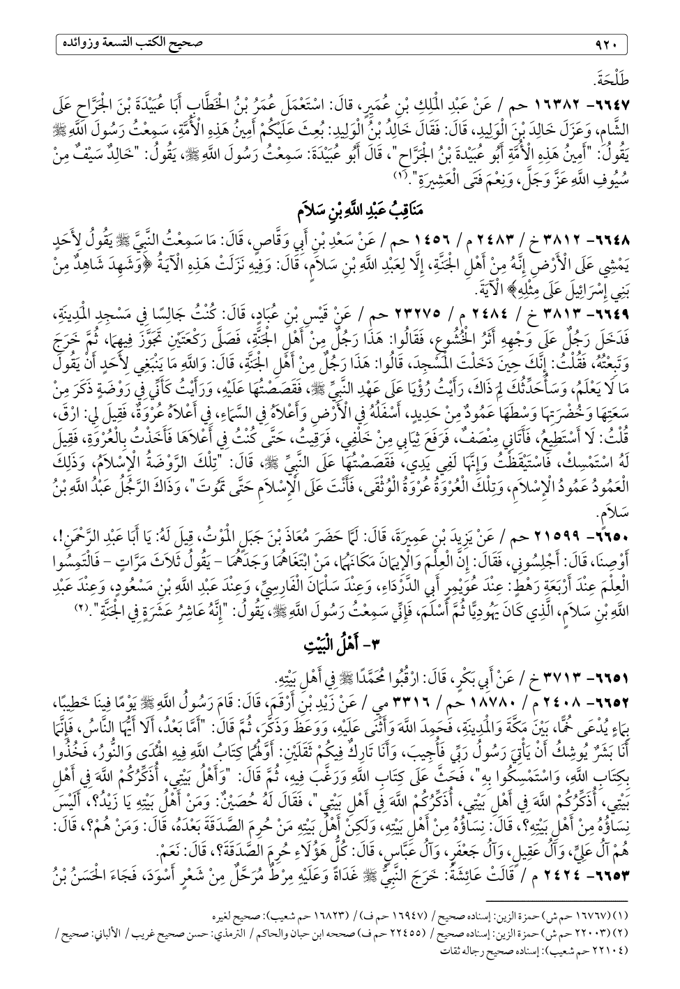 ٦٦٥٢ - ٢٤٠٨ م / ١٨٧٨٠ حم / ٣٣١٦ مي / عَنْ زَيْدِ بْنِ أَرْقَمَ، قَالَ: قَامَ رَسُولُ اللَّهِ - صلى الله عليه وسلم - يَوْمًا فِينَا خَطِيبًا، بِمَاءٍ يُدْعَى خُمًّا، بَيْنَ مَكَّةَ وَالْمَدِينَةِ، فَحَمِدَ اللَّهَ وَأَثْنَى عَلَيْهِ، وَوَعَظَ وَذَكَّرَ، ثُمَّ قَالَ: "أَمَّا بَعْدُ، أَلَا أَيُّهَا النَّاسُ، فَإِنَّمَا أَنَا بَشَرٌ يُوشِكُ أَنْ يَأْتِيَ رَسُولُ رَبِّي فَأُجِيبَ، وَأَنَا تَارِكٌ فِيكُمْ ثَقَلَيْنِ: أَوَّلُهُمَا كِتَابُ اللَّهِ فِيهِ الْهُدَى وَالنُّورُ، فَخُذُوا بِكِتَابِ اللَّهِ، وَاسْتَمْسِكُوا بِهِ"، فَحَثَّ عَلَى كِتَابِ اللَّهِ وَرَغَّبَ فِيهِ، ثُمَّ قَالَ: "وَأَهْلُ بَيْتِي، أُذَكِّرُكُمْ اللَّهَ فِي أَهْلِ بَيْتِي، أُذَكِّرُكُمْ اللَّهَ فِي أَهْلِ بَيْتِي، أُذَكِّرُكُمْ اللَّهَ فِي أَهْلِ بَيْتِي"، فَقَالَ لَهُ حُصَيْنٌ: وَمَنْ أَهْلُ بَيْتِهِ يَا زَيْدُ؟، أَلَيْسَ نِسَاؤُهُ مِنْ أَهْلِ بَيْتِهِ؟، قَالَ: نِسَاؤُهُ مِنْ أَهْلِ بَيْتِهِ، وَلَكِنْ أَهْلُ بَيْتِهِ مَنْ حُرِمَ الصَّدَقَةَ بَعْدَهُ، قَالَ: وَمَنْ هُمْ؟، قَالَ: هُمْ آلُ عَلِيٍّ، وَآلُ عَقِيلٍ، وَآلُ جَعْفَرٍ، وَآلُ عَبَّاسٍ، قَالَ: كُلُّ هَؤُلَاءِ حُرِمَ الصَّدَقَةَ؟، قَالَ: نَعَمْ.