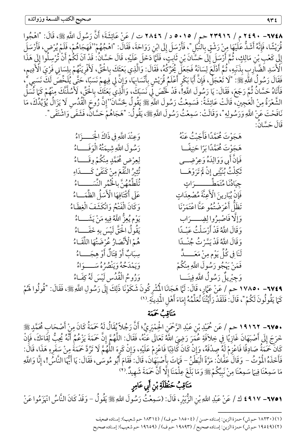 ٦٧٤٨ - ٢٤٩٠ م / ٢٣٩١٦ حم / ٥٠١٥ د / ٢٨٤٦ ت / عَنْ عَائِشَةَ؛ أَنَّ رَسُولَ اللَّهِ - صلى الله عليه وسلم -، قَالَ: "اهْجُوا قُرَيْشًا، فَإِنَّهُ أَشَدُّ عَلَيْهَا مِنْ رَشْقٍ بِالنَّبْلِ"، فَأَرْسَلَ إِلَى ابْنِ رَوَاحَةَ، فَقَالَ: "اهْجُهُمْ"فَهَجَاهُمْ، فَلَمْ يُرْضِ، فَأَرْسَلَ إِلَى كَعْبِ بْنِ مَالِكٍ، ثُمَّ أَرْسَلَ إِلَى حَسَّانَ بْنِ ثَابِتٍ، فَلَمَّا دَخَلَ عَلَيْهِ، قَالَ حَسَّانُ: قَدْ آنَ لَكُمْ أَنْ تُرْسِلُوا إِلَى هَذَا الْأَسَدِ الضَّارِبِ بِذَنَبِهِ، ثُمَّ أَدْلَعَ لِسَانَهُ فَجَعَلَ يُحَرِّكُهُ، فَقَالَ: وَالَّذِي بَعَثَكَ بِالْحَقِّ، لَأَفْرِيَنَّهُمْ بِلِسَانِي فَرْيَ الْأَدِيمِ، فَقَالَ رَسُولُ اللَّهِ - صلى الله عليه وسلم -: "لَا تَعْجَلْ، فَإِنَّ أَبَا بَكْرٍ أَعْلَمُ قُرَيْشٍ بِأَنْسَابِهَا، وَإِنَّ لِي فِيهِمْ نَسَبًا، حَتَّى يُلَخِّصَ لَكَ نَسَبِي"، فَأَتَاهُ حَسَّانُ ثُمَّ رَجَعَ، فَقَالَ: يَا رَسُولَ اللَّهِ!، قَدْ لَخَّصَ لِي نَسَبَكَ، وَالَّذِي بَعَثَكَ بِالْحَقِّ، لَأَسُلَّنَّكَ مِنْهُمْ كَمَا تُسَلُّ الشَّعْرَةُ مِنْ الْعَجِينِ، قَالَتْ عَائِشَةُ: فَسَمِعْتُ رَسُولَ اللَّهِ - صلى الله عليه وسلم - يَقُولُ لِحَسَّانَ"إِنَّ رُوحَ الْقُدُسِ لَا يَزَالُ يُؤَيِّدُكَ، مَا نَافَحْتَ عَنْ اللَّهِ وَرَسُولِهِ"، وَقَالَتْ: سَمِعْتُ رَسُولَ اللَّهِ - صلى الله عليه وسلم -، يَقُولُ: "هَجَاهُمْ حَسَّانُ، فَشَفَى وَاشْتَفَى".