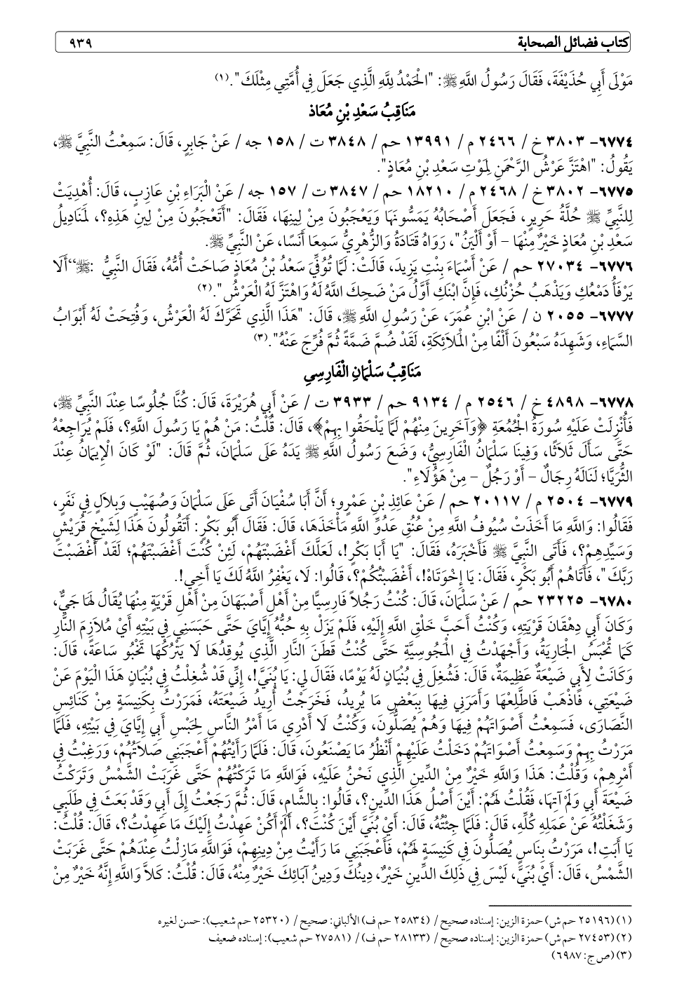 ٦٧٧٨ - ٤٨٩٨ خ / ٢٥٤٦ م / ٩١٣٤ حم / ٣٩٣٣ ت / عَنْ أَبِي هُرَيْرَةَ، قَالَ: كُنَّا جُلُوسًا عِنْدَ النَّبِيِّ - صلى الله عليه وسلم -، فَأُنْزِلَتْ عَلَيْهِ سُورَةُ الْجُمُعَةِ {وَآخَرِينَ مِنْهُمْ لَمَّا يَلْحَقُوا بِهِمْ}، قَالَ: قُلْتُ: مَنْ هُمْ يَا رَسُولَ اللَّهِ؟، فَلَمْ يُرَاجِعْهُ حَتَّى سَأَلَ ثَلَاثًا، وَفِينَا سَلْمَانُ الْفَارِسِيُّ، وَضَعَ رَسُولُ اللَّهِ - صلى الله عليه وسلم - يَدَهُ عَلَى سَلْمَانَ، ثُمَّ قَالَ: "لَوْ كَانَ الْإِيمَانُ عِنْدَ الثُّرَيَّا؛ لَنَالَهُ رِجَالٌ - أَوْ رَجُلٌ - مِنْ هَؤُلَاءِ".