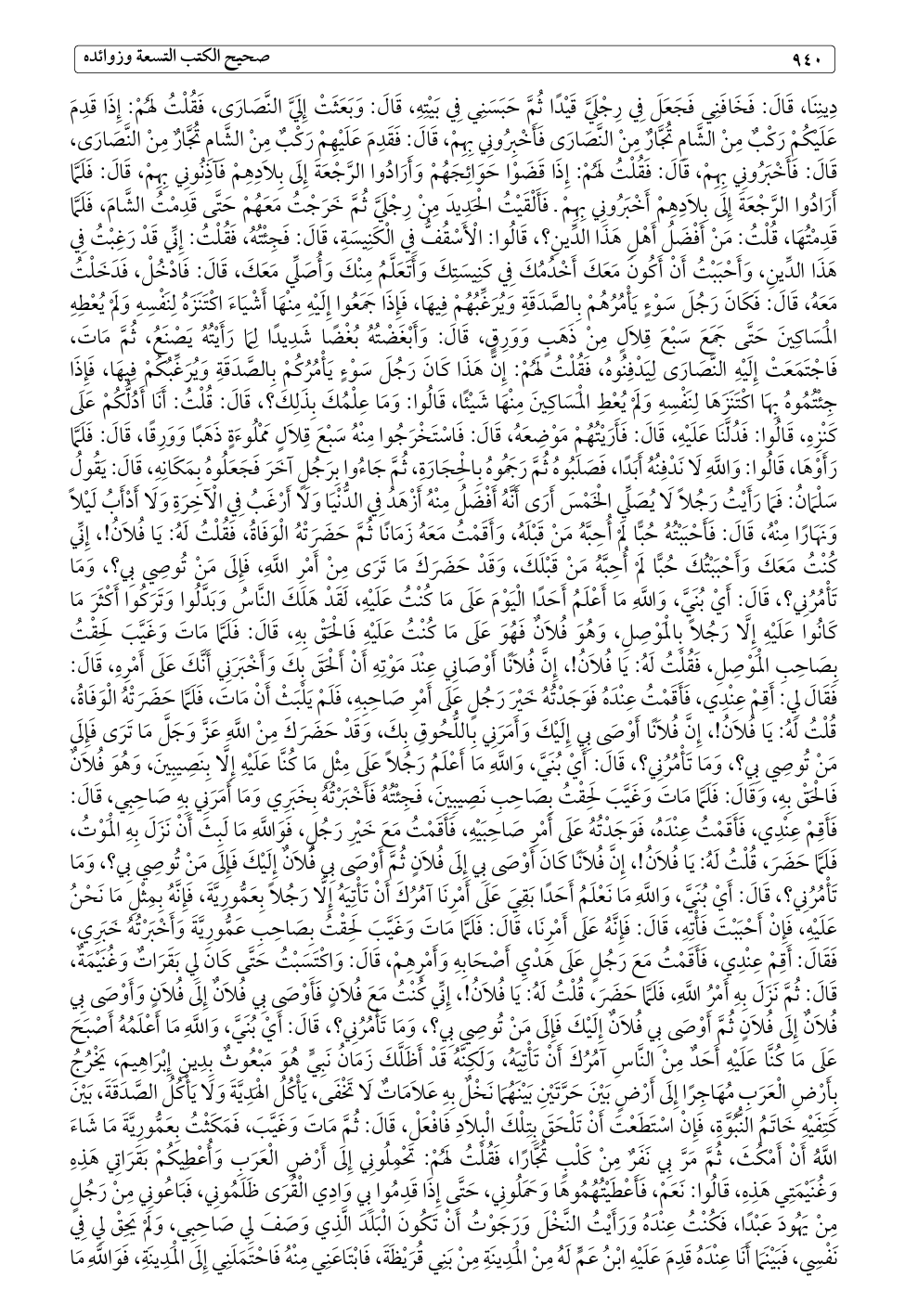 عَلَى أَمْرِ صَاحِبِهِ، فَلَمْ يَلْبَثْ أَنْ مَاتَ، فَلَمَّا حَضَرَتْهُ الْوَفَاةُ، قُلْتُ لَهُ: يَا فُلَانُ!، إِنَّ فُلَانًا أَوْصَى بِي إِلَيْكَ وَأَمَرَنِي بِاللُّحُوقِ بِكَ، وَقَدْ حَضَرَكَ مِنْ اللَّهِ عَزَّ وَجَلَّ مَا تَرَى فَإِلَى مَنْ تُوصِي بِي؟، وَمَا تَأْمُرُنِي؟، قَالَ: أَيْ بُنَيَّ، وَاللَّهِ مَا أَعْلَمُ رَجُلًا عَلَى مِثْلِ مَا كُنَّا عَلَيْهِ إِلَّا بِنَصِيبِينَ، وَهُوَ فُلَانٌ فَالْحَقْ بِهِ، وَقَالَ: فَلَمَّا مَاتَ وَغَيَّبَ لَحِقْتُ بِصَاحِبِ نَصِيبِينَ، فَجِئْتُهُ فَأَخْبَرْتُهُ بِخَبَرِي وَمَا أَمَرَنِي بِهِ صَاحِبِي، قَالَ: فَأَقِمْ عِنْدِي، فَأَقَمْتُ عِنْدَهُ، فَوَجَدْتُهُ عَلَى أَمْرِ صَاحِبَيْهِ، فَأَقَمْتُ مَعَ خَيْرِ رَجُلٍ، فَوَاللَّهِ مَا لَبِثَ أَنْ نَزَلَ بِهِ الْمَوْتُ، فَلَمَّا حَضَرَ، قُلْتُ لَهُ: يَا فُلَانُ!، إِنَّ فُلَانًا كَانَ أَوْصَى بِي إِلَى فُلَانٍ ثُمَّ أَوْصَى بِي فُلَانٌ إِلَيْكَ فَإِلَى مَنْ تُوصِي بِي؟، وَمَا تَأْمُرُنِي؟، قَالَ: أَيْ بُنَيَّ، وَاللَّهِ مَا نَعْلَمُ أَحَدًا بَقِيَ عَلَى أَمْرِنَا آمُرُكَ أَنْ تَأْتِيَهُ إِلَّا رَجُلًا بِعَمُّورِيَّةَ، فَإِنَّهُ بِمِثْلِ مَا نَحْنُ عَلَيْهِ، فَإِنْ أَحْبَبْتَ فَأْتِهِ، قَالَ: فَإِنَّهُ عَلَى أَمْرِنَا، قَالَ: فَلَمَّا مَاتَ وَغَيَّبَ لَحِقْتُ بِصَاحِبِ عَمُّورِيَّةَ وَأَخْبَرْتُهُ خَبَرِي، فَقَالَ: أَقِمْ عِنْدِي، فَأَقَمْتُ مَعَ رَجُلٍ عَلَى هَدْيِ أَصْحَابِهِ وَأَمْرِهِمْ، قَالَ: وَاكْتَسَبْتُ حَتَّى كَانَ لِي بَقَرَاتٌ وَغُنَيْمَةٌ، قَالَ: ثُمَّ نَزَلَ بِهِ أَمْرُ اللَّهِ، فَلَمَّا حَضَرَ، قُلْتُ لَهُ: يَا فُلَانُ!، إِنِّي كُنْتُ مَعَ فُلَانٍ فَأَوْصَى بِي فُلَانٌ إِلَى فُلَانٍ وَأَوْصَى بِي فُلَانٌ إِلَى فُلَانٍ ثُمَّ أَوْصَى بِي فُلَانٌ إِلَيْكَ فَإِلَى مَنْ تُوصِي