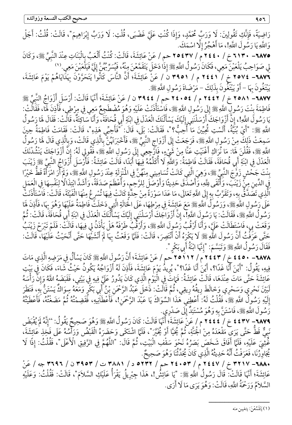٦٨٧٧ - ٢٥٨١ خ / ٢٤٤٢ م / ٢٤٠٥٤ حم / ٣٩٤٤ ن / عَنْ عَائِشَةَ؛ أَنَّهَا قَالَتْ: أَرْسَلَ أَزْوَاجُ النَّبِيِّ - صلى الله عليه وسلم - فَاطِمَةَ بِنْتَ رَسُولِ اللَّهِ - صلى الله عليه وسلم - إِلَى رَسُولِ اللَّهِ - صلى الله عليه وسلم -، فَاسْتَأْذَنَتْ عَلَيْهِ وَهُوَ مُضْطَجِعٌ مَعِي فِي مِرْطِي، فَأَذِنَ لَهَا، فَقَالَتْ: يَا رَسُولَ اللَّهِ!، إِنَّ أَزْوَاجَكَ أَرْسَلْنَنِي إِلَيْكَ يَسْأَلْنَكَ الْعَدْلَ فِي ابْنَةِ أَبِي قُحَافَةَ، وَأَنَا سَاكِتَةٌ، قَالَتْ: فَقَالَ لَهَا رَسُولُ اللَّهِ - صلى الله عليه وسلم -: "أَيْ بُنَيَّةُ، أَلَسْتِ تُحِبِّينَ مَا أُحِبُّ؟ "، فَقَالَتْ: بَلَى، قَالَ: "فَأَحِبِّي هَذِهِ"، قَالَتْ: فَقَامَتْ فَاطِمَةُ حِينَ سَمِعَتْ ذَلِكَ مِنْ رَسُولِ اللَّهِ - صلى الله عليه وسلم -، فَرَجَعَتْ إِلَى أَزْوَاجِ النَّبِيِّ - صلى الله عليه وسلم -، فَأَخْبَرَتْهُنَّ بِالَّذِي قَالَتْ، وَبِالَّذِي قَالَ لَهَا رَسُولُ اللَّهِ - صلى الله عليه وسلم -، فَقُلْنَ لَهَا: مَا نُرَاكِ أَغْنَيْتِ عَنَّا مِنْ شَيْءٍ، فَارْجِعِي إِلَى رَسُولِ اللَّهِ - صلى الله عليه وسلم -، فَقُولِي لَهُ: إِنَّ أَزْوَاجَكَ يَنْشُدْنَكَ الْعَدْلَ فِي ابْنَةِ أَبِي قُحَافَةَ، فَقَالَتْ فَاطِمَةُ: وَاللَّهِ لَا أُكَلِّمُهُ فِيهَا أَبَدًا، قَالَتْ عَائِشَةُ: فَأَرْسَلَ أَزْوَاجُ النَّبِيِّ - صلى الله عليه وسلم - زَيْنَبَ بِنْتَ جَحْشٍ زَوْجَ النَّبِيِّ - صلى الله عليه وسلم -، وَهِيَ الَّتِي كَانَتْ تُسَامِينِي مِنْهُنَّ فِي الْمَنْزِلَةِ عِنْدَ رَسُولِ اللَّهِ - صلى الله عليه وسلم -، وَلَمْ أَرَ امْرَأَةً قَطُّ خَيْرًا فِي الدِّينِ مِنْ زَيْنَبَ، وَأَتْقَى لِلَّهِ، وَأَصْدَقَ حَدِيثًا وَأَوْصَلَ لِلرَّحِمِ، وَأَعْظَمَ صَدَقَةً، وَأَشَدَّ ابْتِذَالًا لِنَفْسِهَا فِي الْعَمَلِ الَّذِي