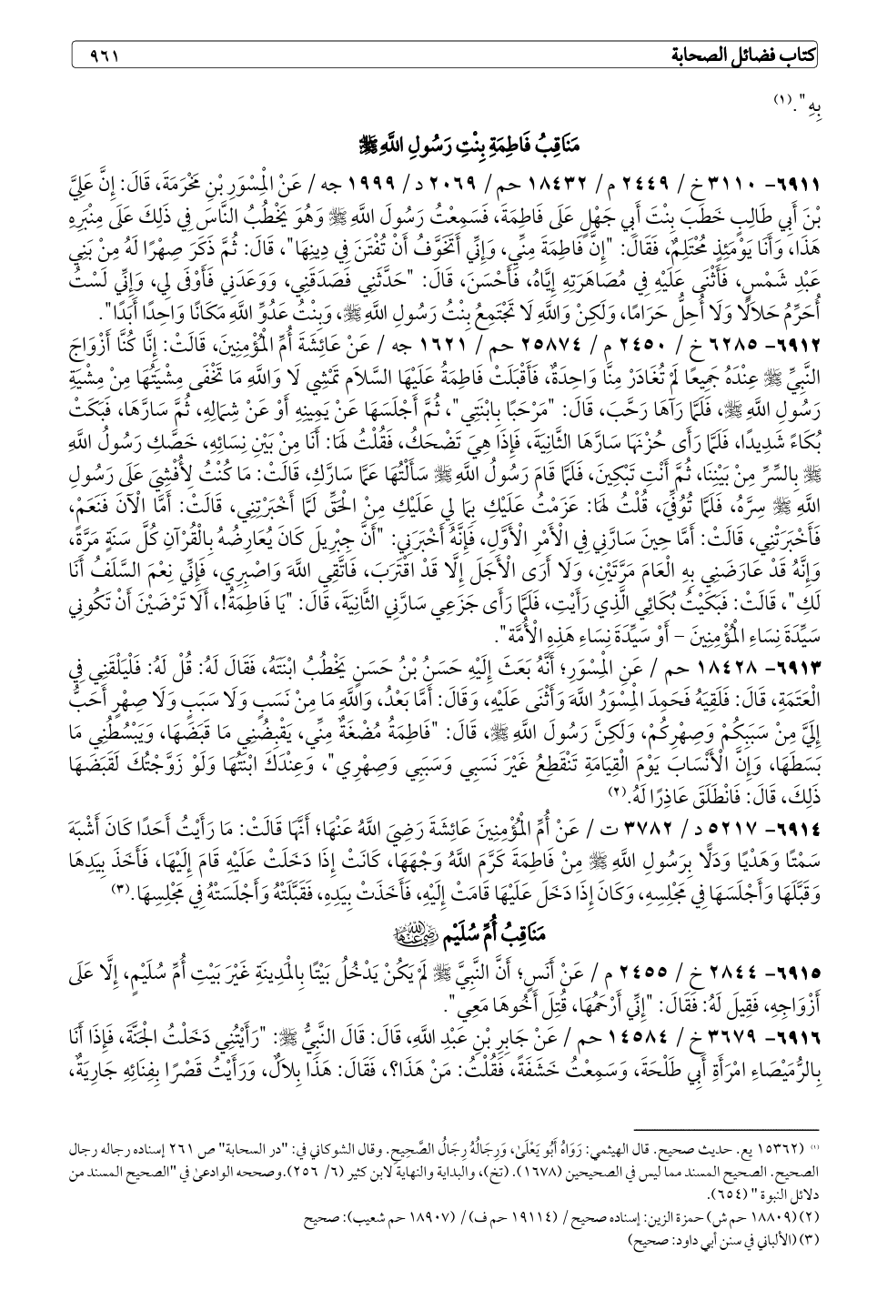 ٦٩١٢ - ٦٢٨٥ خ / ٢٤٥٠ م / ٢٥٨٧٤ حم / ١٦٢١ جه / عَنْ عَائِشَةَ أُمِّ الْمُؤْمِنِينَ، قَالَتْ: إِنَّا كُنَّا أَزْوَاجَ النَّبِيِّ - صلى الله عليه وسلم - عِنْدَهُ جَمِيعًا لَمْ تُغَادَرْ مِنَّا وَاحِدَةٌ، فَأَقْبَلَتْ فَاطِمَةُ عَلَيْهَا السَّلَام تَمْشِي لَا وَاللَّهِ مَا تَخْفَى مِشْيَتُهَا مِنْ مِشْيَةِ رَسُولِ اللَّهِ - صلى الله عليه وسلم -، فَلَمَّا رَأَىهَا رَحَّبَ، قَالَ: "مَرْحَبًا بِابْنَتِي"، ثُمَّ أَجْلَسَهَا عَنْ يَمِينِهِ أَوْ عَنْ شِمَالِهِ، ثُمَّ سَارَّهَا، فَبَكَتْ بُكَاءً شَدِيدًا، فَلَمَّا رَأَى حُزْنَهَا سَارَّهَا الثَّانِيَةَ، فَإِذَا هِيَ تَضْحَكُ، فَقُلْتُ لَهَا: أَنَا مِنْ بَيْنِ نِسَائِهِ، خَصَّكِ رَسُولُ اللَّهِ - صلى الله عليه وسلم - بِالسِّرِّ مِنْ بَيْنِنَا، ثُمَّ أَنْتِ تَبْكِينَ، فَلَمَّا قَامَ رَسُولُ اللَّهِ - صلى الله عليه وسلم - سَأَلْتُهَا عَمَّا سَارَّكِ، قَالَتْ: مَا كُنْتُ لِأُفْشِيَ عَلَى رَسُولِ اللَّهِ - صلى الله عليه وسلم - سِرَّهُ، فَلَمَّا تُوُفِّيَ، قُلْتُ لَهَا: عَزَمْتُ عَلَيْكِ بِمَا لِي عَلَيْكِ مِنْ الْحَقِّ لَمَّا أَخْبَرْتِنِي، قَالَتْ: أَمَّا الْآنَ فَنَعَمْ، فَأَخْبَرَتْنِي، قَالَتْ: أَمَّا حِينَ سَارَّنِي فِي الْأَمْرِ الْأَوَّلِ، فَإِنَّهُ أَخْبَرَنِي: "أَنَّ جِبْرِيلَ كَانَ يُعَارِضُهُ بِالْقُرْآنِ كُلَّ سَنَةٍ مَرَّةً، وَإِنَّهُ قَدْ عَارَضَنِي بِهِ الْعَامَ مَرَّتَيْنِ، وَلَا أَرَى الْأَجَلَ إِلَّا قَدْ اقْتَرَبَ، فَاتَّقِي اللَّهَ وَاصْبِرِي، فَإِنِّي نِعْمَ السَّلَفُ أَنَا لَكِ"، قَالَتْ: فَبَكَيْتُ بُكَائِي الَّذِي رَأَيْتِ، فَلَمَّا رَأَى جَزَعِي سَارَّنِي الثَّانِيَةَ، قَالَ: "يَا فَاطِمَةُ!، أَلَا تَرْضَيْنَ أَنْ تَكُونِي سَيِّدَةَ نِسَاءِ الْمُؤْمِنِينَ - أَوْ سَيِّدَةَ نِسَاءِ هَذِهِ الْأُمَّة".