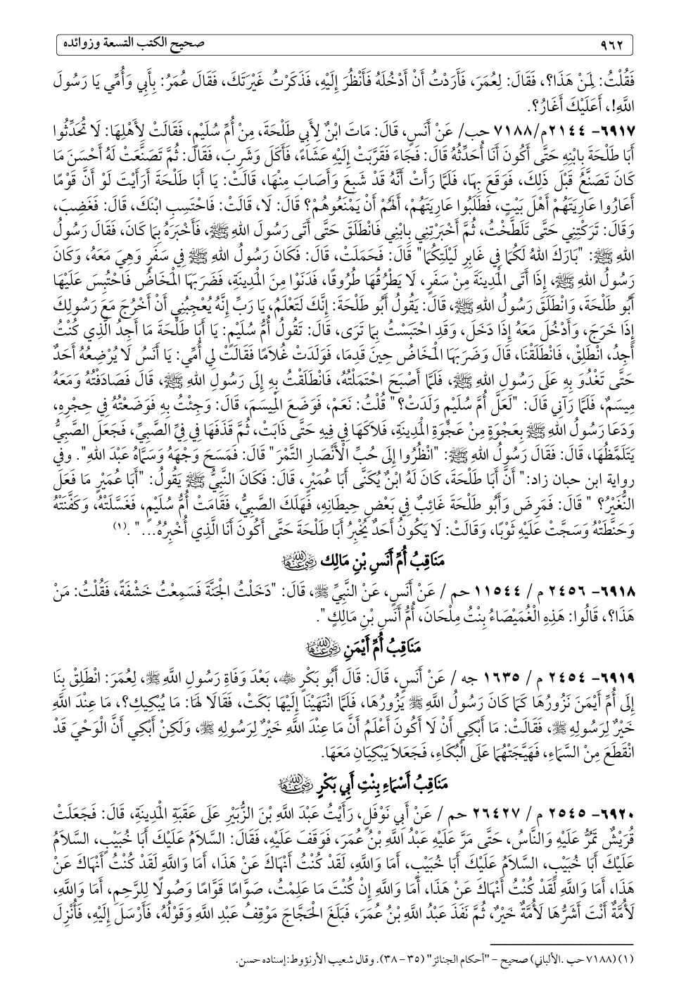 ٦٩١٩ - ٢٤٥٤ م / ١٦٣٥ جه / عَنْ أَنَسٍ، قَالَ: قَالَ أَبُو بَكْرٍ - رضي الله عنه -، بَعْدَ وَفَاةِ رَسُولِ اللَّهِ - صلى الله عليه وسلم -، لِعُمَرَ: انْطَلِقْ بِنَا إِلَى أُمِّ أَيْمَنَ نَزُورُهَا كَمَا كَانَ رَسُولُ اللَّهِ - صلى الله عليه وسلم - يَزُورُهَا، فَلَمَّا انْتَهَيْنَا إِلَيْهَا بَكَتْ، فَقَالَا لَهَا: مَا يُبْكِيكِ؟، مَا عِنْدَ اللَّهِ خَيْرٌ لِرَسُولِهِ - صلى الله عليه وسلم -، فَقَالَتْ: مَا أَبْكِي أَنْ لَا أَكُونَ أَعْلَمُ أَنَّ مَا عِنْدَ اللَّهِ خَيْرٌ لِرَسُولِهِ - صلى الله عليه وسلم -، وَلَكِنْ أَبْكِي أَنَّ الْوَحْيَ قَدْ انْقَطَعَ مِنْ السَّمَاءِ، فَهَيَّجَتْهُمَا عَلَى الْبُكَاءِ، فَجَعَلَا يَبْكِيَانِ مَعَهَا.
