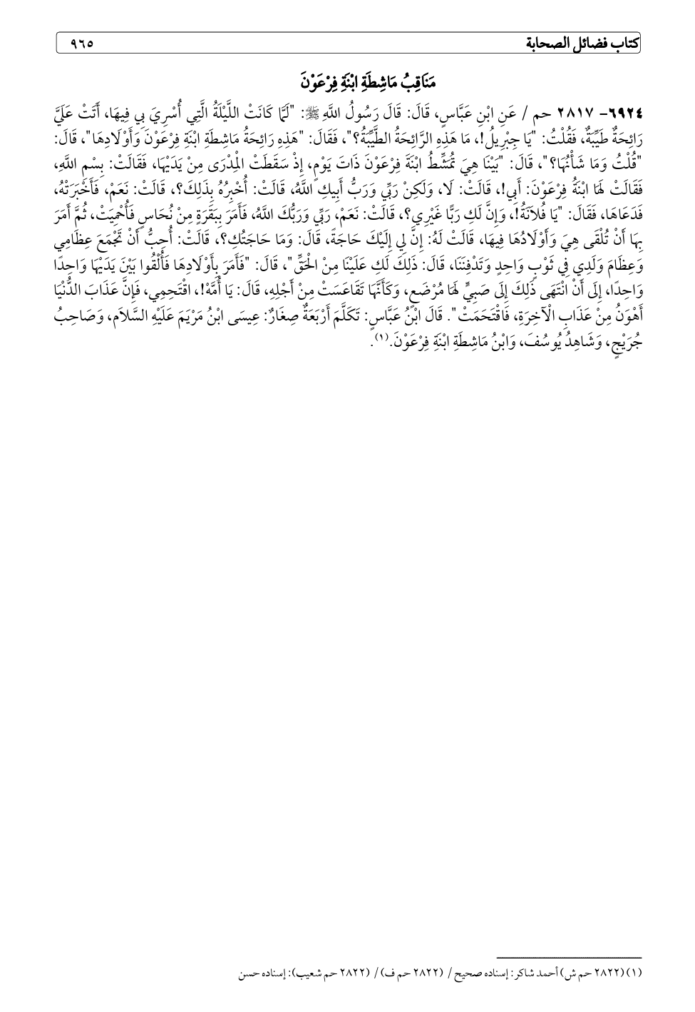 ٦٩٢٤ - ٢٨١٧ حم / عَنِ ابْنِ عَبَّاسٍ، قَالَ: قَالَ رَسُولُ اللَّهِ - صلى الله عليه وسلم -: "لَمَّا كَانَتْ اللَّيْلَةُ الَّتِي أُسْرِيَ بِي فِيهَا، أَتَتْ عَلَيَّ رَائِحَةٌ طَيِّبَةٌ، فَقُلْتُ: "يَا جِبْرِيلُ!، مَا هَذِهِ الرَّائِحَةُ الطَّيِّبَةُ؟ "، فَقَالَ: "هَذِهِ رَائِحَةُ مَاشِطَةِ ابْنَةِ فِرْعَوْنَ وَأَوْلَادِهَا"، قَالَ: "قُلْتُ وَمَا شَأْنُهَا؟ "، قَالَ: "بَيْنَا هِيَ تُمَشِّطُ ابْنَةَ فِرْعَوْنَ ذَاتَ يَوْمٍ، إِذْ سَقَطَتْ الْمِدْرَى مِنْ يَدَيْهَا، فَقَالَتْ: بِسْمِ اللَّهِ، فَقَالَتْ لَهَا ابْنَةُ فِرْعَوْنَ: أَبِي!، قَالَتْ: لَا، وَلَكِنْ رَبِّي وَرَبُّ أَبِيكِ اللَّهُ، قَالَتْ: أُخْبِرُهُ بِذَلِكَ؟، قَالَتْ: نَعَمْ، فَأَخْبَرَتْهُ، فَدَعَاهَا، فَقَالَ: "يَا فُلَانَةُ!، وَإِنَّ لَكِ رَبًّا غَيْرِي؟، قَالَتْ: نَعَمْ، رَبِّي وَرَبُّكَ اللَّهُ، فَأَمَرَ بِبَقَرَةٍ مِنْ نُحَاسٍ فَأُحْمِيَتْ، ثُمَّ أَمَرَ بِهَا أَنْ تُلْقَى هِيَ وَأَوْلَادُهَا فِيهَا، قَالَتْ لَهُ: إِنَّ لِي إِلَيْكَ حَاجَةً، قَالَ: وَمَا حَاجَتُكِ؟، قَالَتْ: أُحِبُّ أَنْ تَجْمَعَ عِظَامِي وَعِظَامَ وَلَدِي فِي ثَوْبٍ وَاحِدٍ وَتَدْفِنَنَا، قَالَ: ذَلِكَ لَكِ عَلَيْنَا مِنْ الْحَقِّ"، قَالَ: "فَأَمَرَ بِأَوْلَادِهَا فَأُلْقُوا بَيْنَ يَدَيْهَا وَاحِدًا وَاحِدًا، إِلَى أَنْ انْتَهَى ذَلِكَ إِلَى صَبِيٍّ لَهَا مُرْضَعٍ، وَكَأَنَّهَا تَقَاعَسَتْ مِنْ أَجْلِهِ، قَالَ: يَا أُمَّهْ!، اقْتَحِمِي، فَإِنَّ عَذَابَ الدُّنْيَا أَهْوَنُ مِنْ عَذَابِ الْآخِرَةِ، فَاقْتَحَمَتْ". قَالَ ابْنُ عَبَّاسٍ: تَكَلَّمَ أَرْبَعَةٌ صِغَارٌ: عِيسَى ابْنُ مَرْيَمَ عَلَيْهِ السَّلَام، وَصَاحِبُ جُرَيْجٍ، وَشَاهِدُ يُوسُفَ، وَابْنُ مَاشِطَةِ ابْنَةِ فِرْعَوْنَ. (¬١).
