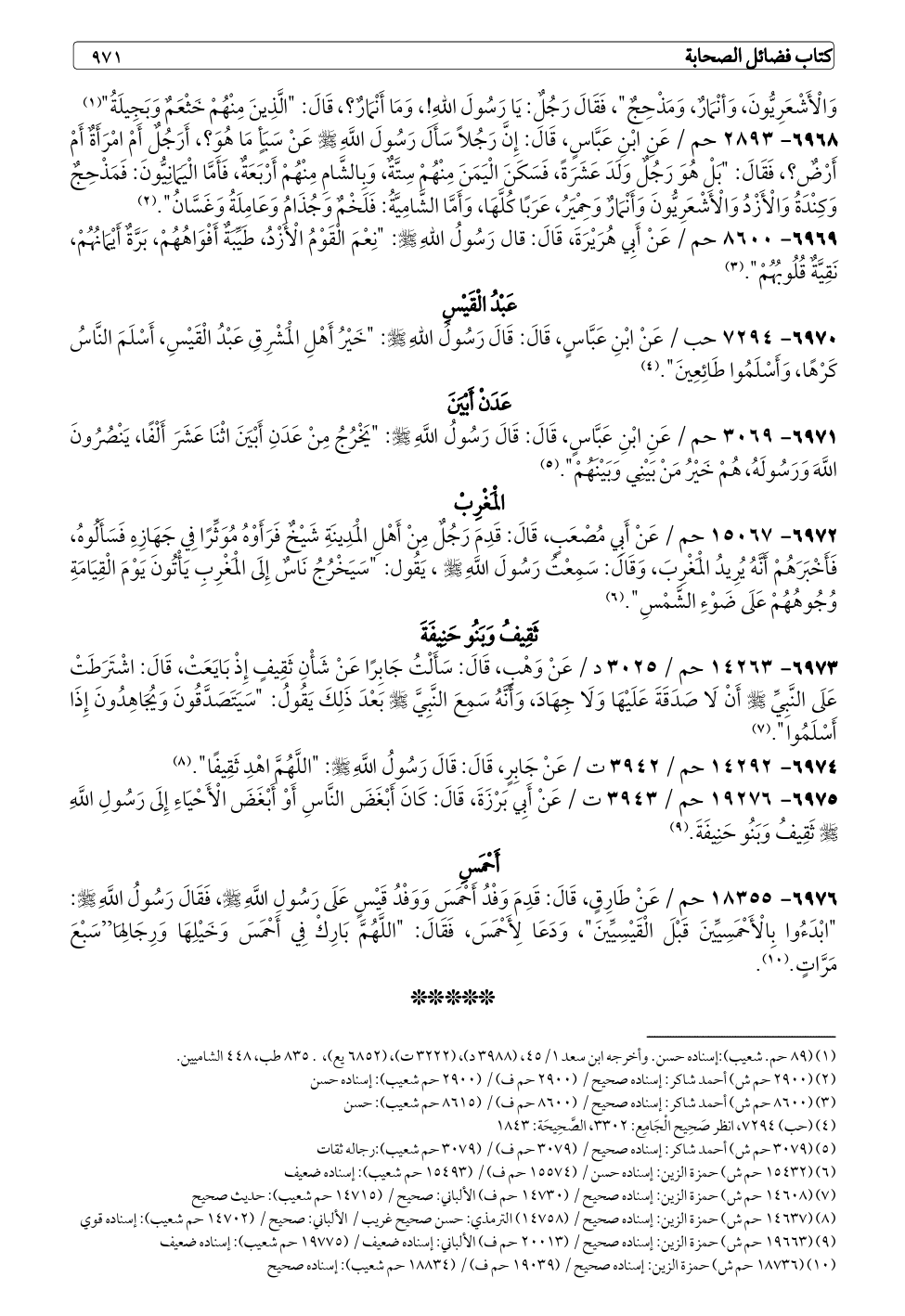٦٩٧٦ - ١٨٣٥٥ حم / عَنْ طَارِقٍ، قَالَ: قَدِمَ وَفْدُ أَحْمَسَ وَوَفْدُ قَيْسٍ عَلَى رَسُولِ اللَّهِ - صلى الله عليه وسلم -، فَقَالَ رَسُولُ اللَّهِ - صلى الله عليه وسلم -: "ابْدَءُوا بِالْأَحْمَسِيِّينَ قَبْلَ الْقَيْسِيِّينَ"، وَدَعَا لِأَحْمَسَ، فَقَالَ: "اللَّهُمَّ بَارِكْ فِي أَحْمَسَ وَخَيْلِهَا وَرِجَالِهَا"سَبْعَ مَرَّاتٍ. (¬١٠).
